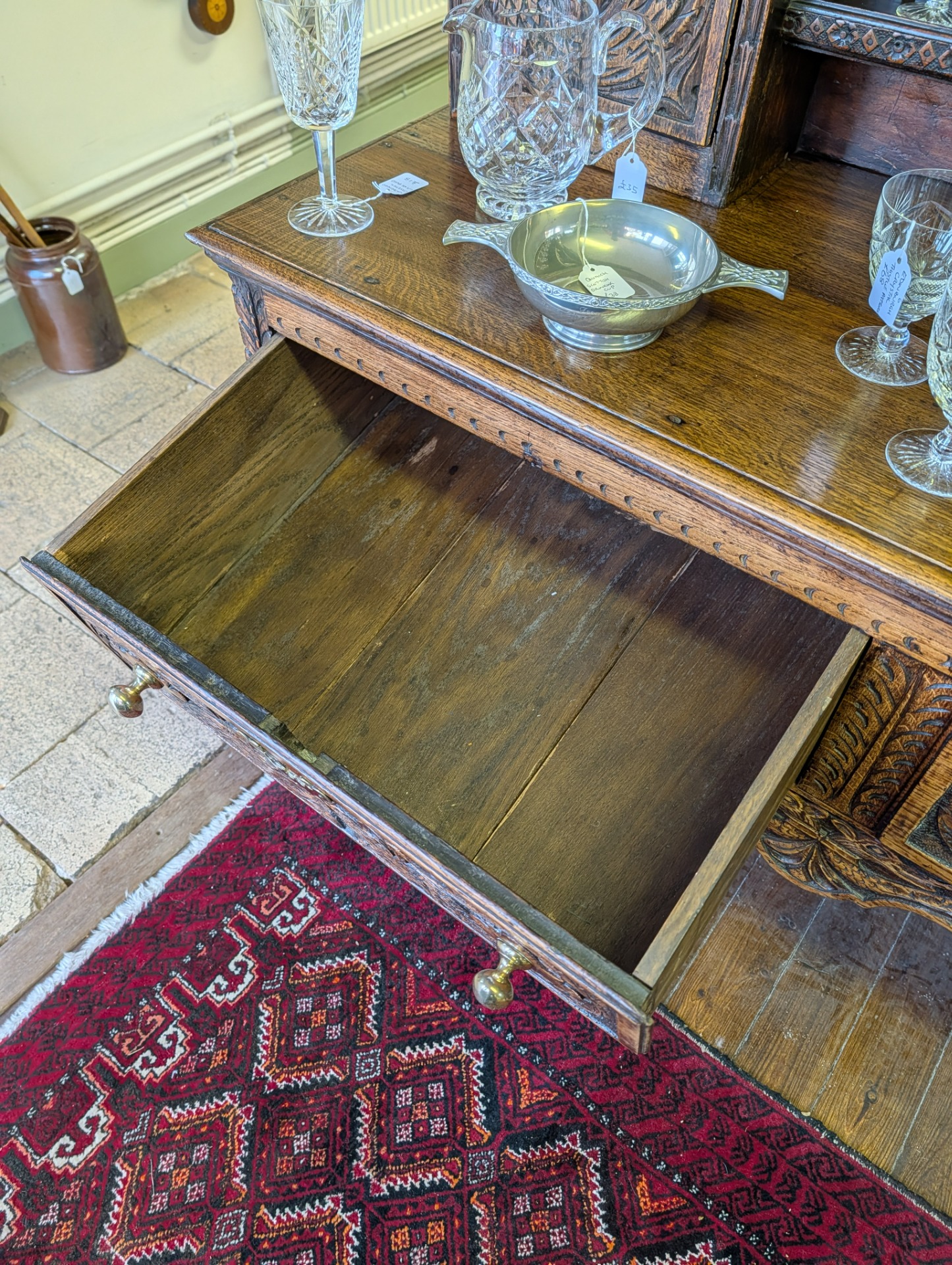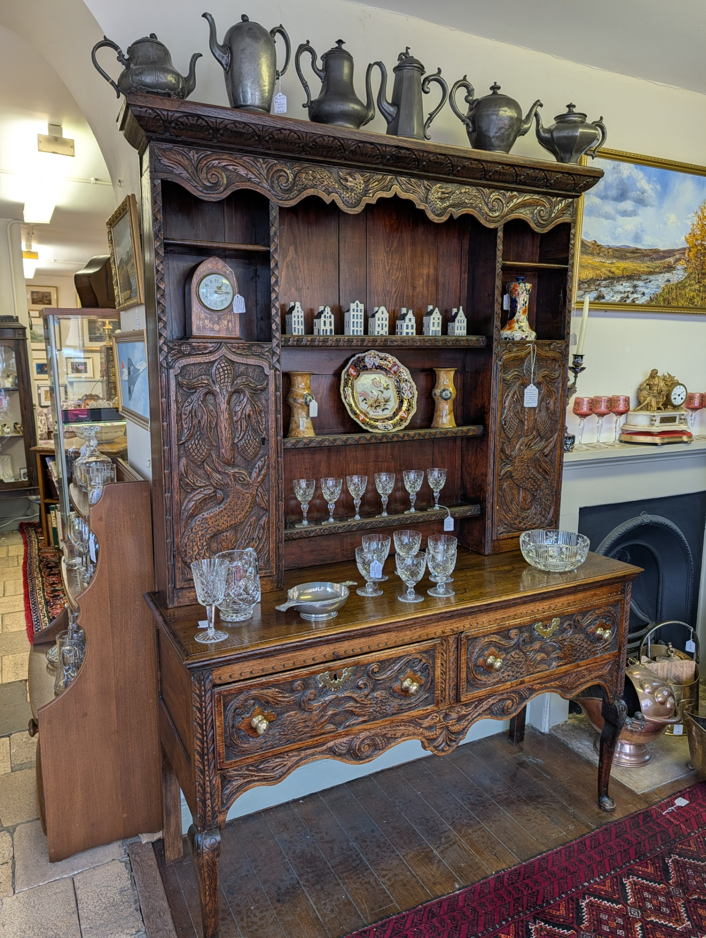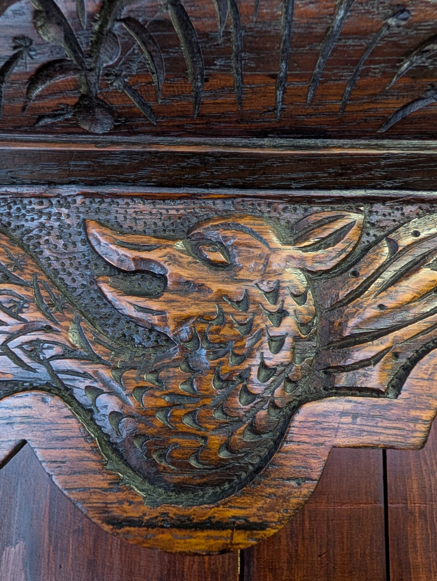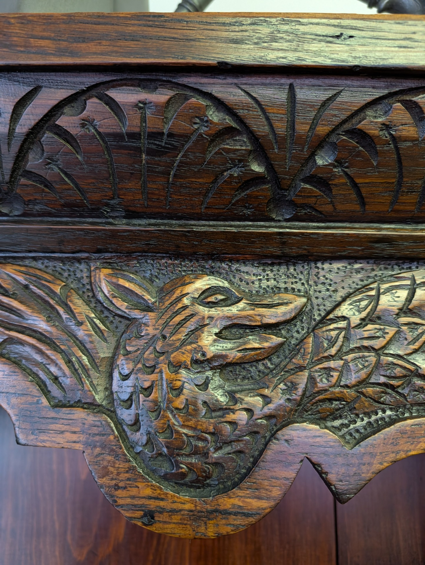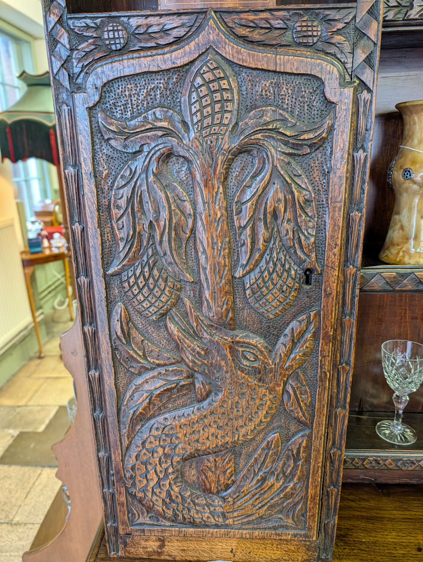 This is a really interesting piece, it was bought by its last owner in Northern Ireland in around 1930, and had at that time been in a farm house there for a considerable number of years. From its design it looks English, but is themed with Dragons or Wyverns and possibly Leeks..... so maybe Welsh???