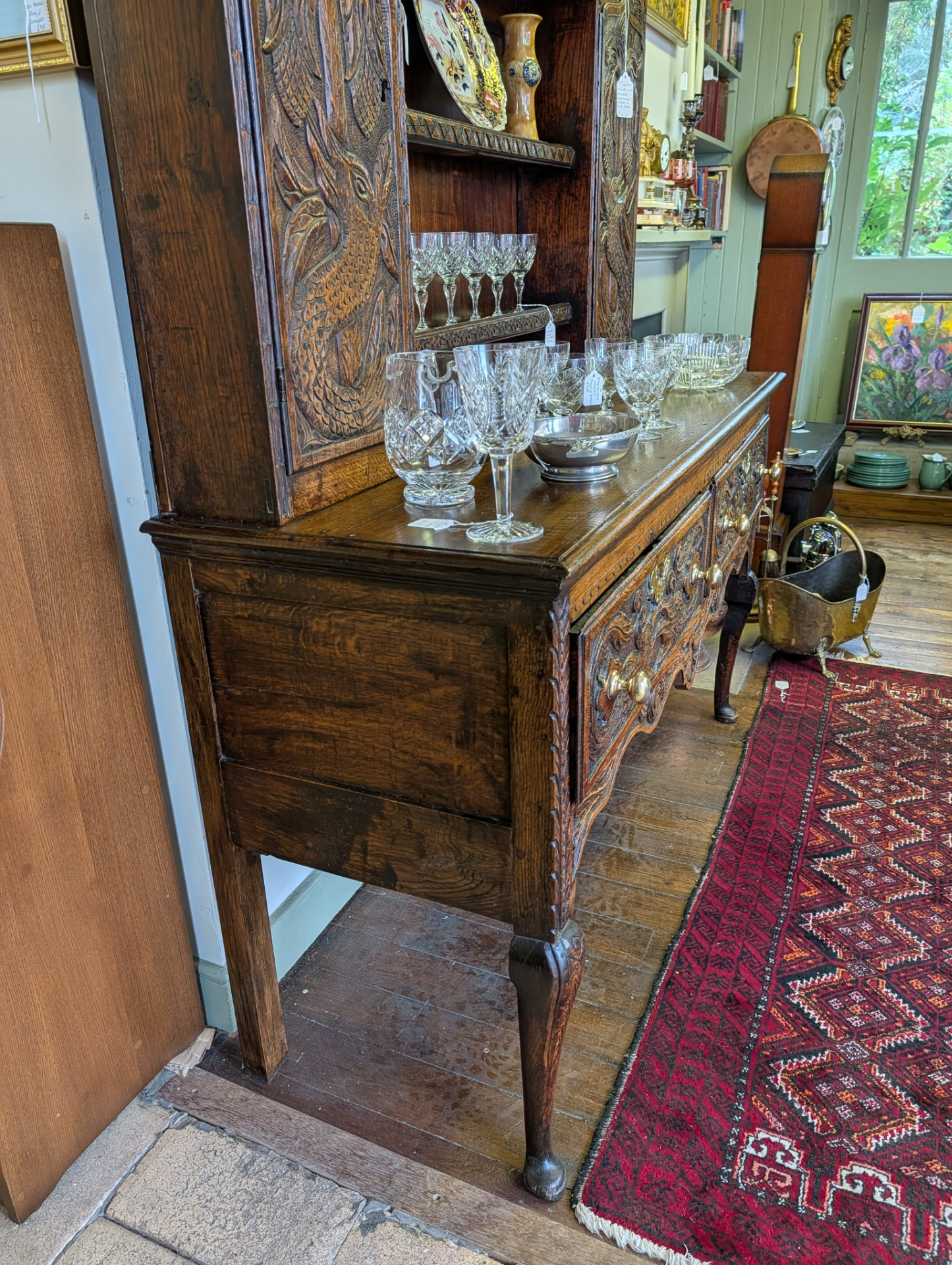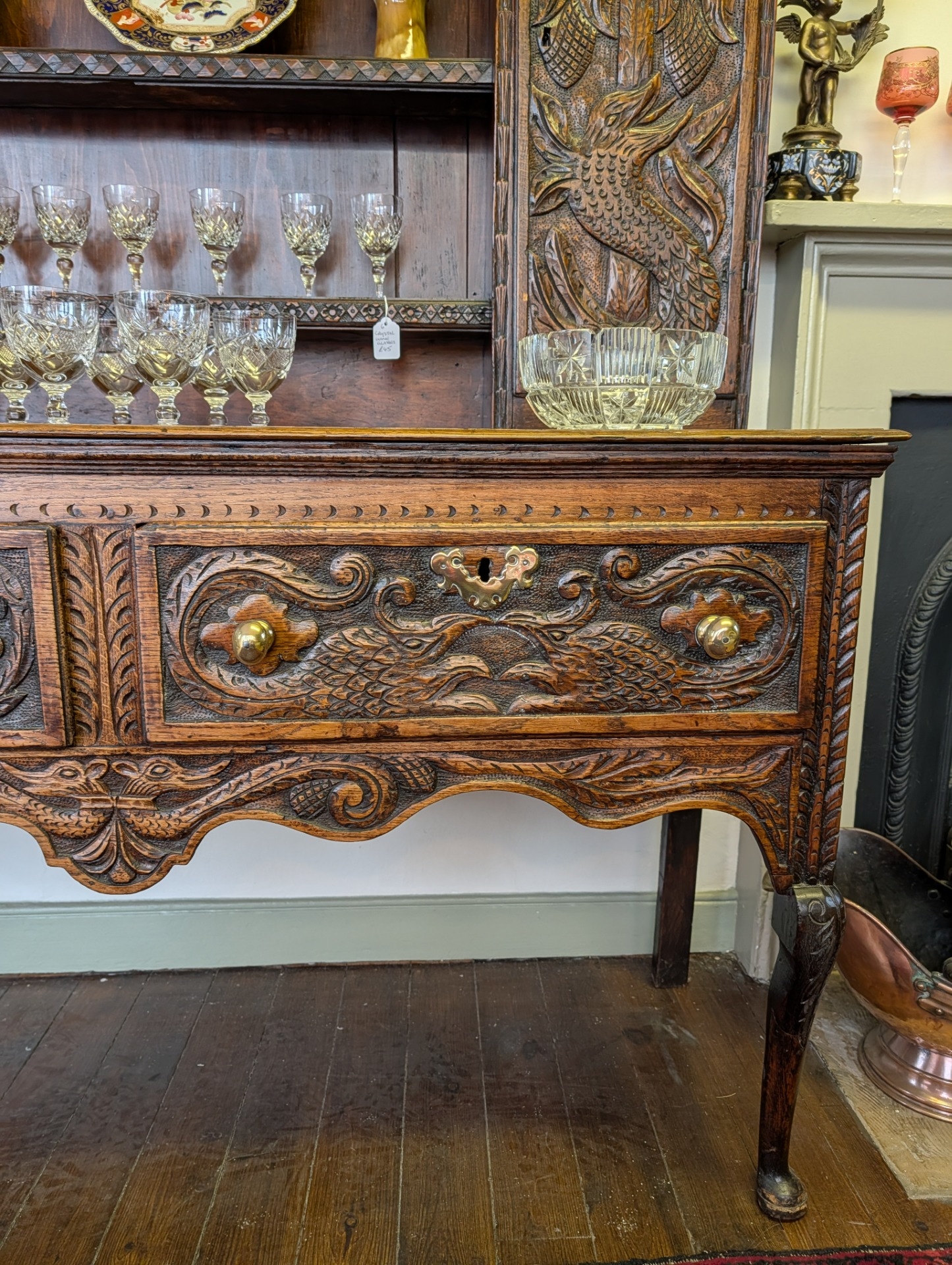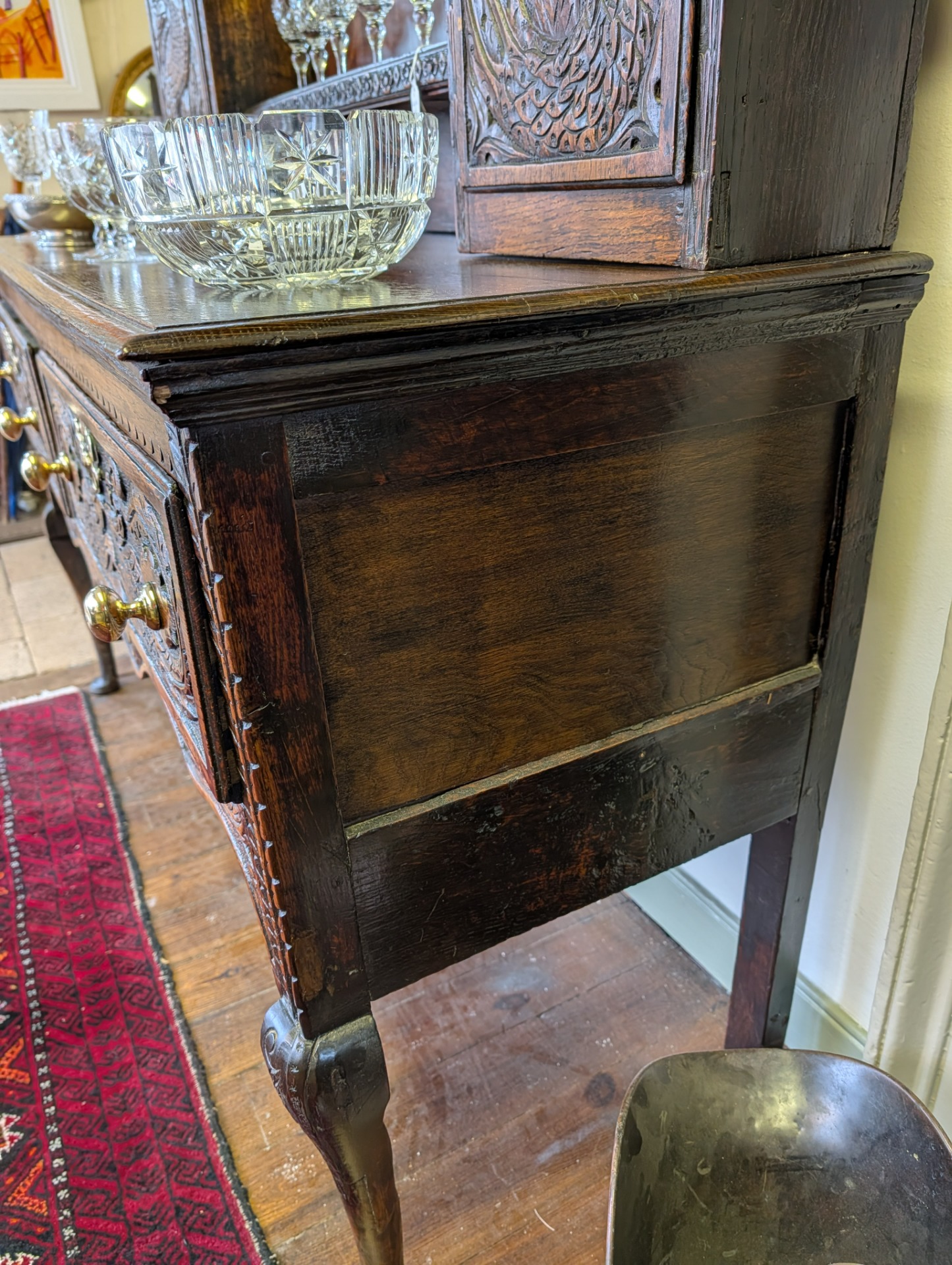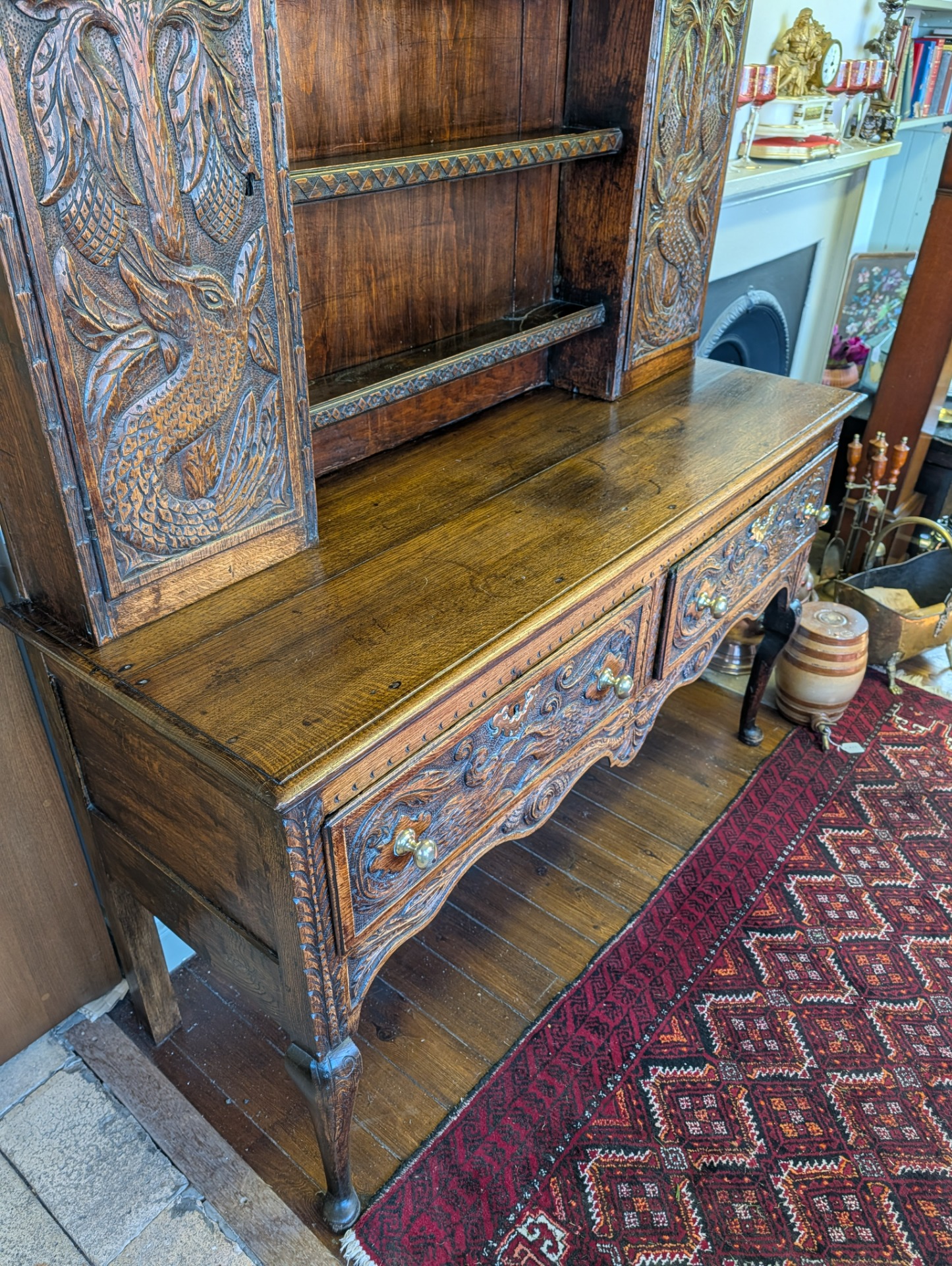 As it is, its a beautiful piece of furniture, in wonderful condition for its 250+ years of age with a deep shine and lovely patina that only time can bring. The unit comes in two pieces, the lower section incorporating two large ornately carved drawers with brass handles, and key holes (no keys or locks for the drawers) above a scalloped frieze. The upper section, with shelves and two cupboards both with locks and keys, provide for additional storage, all below another ornately carved frieze.