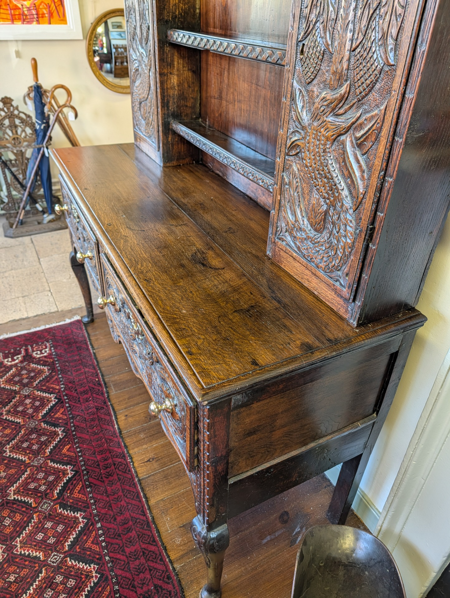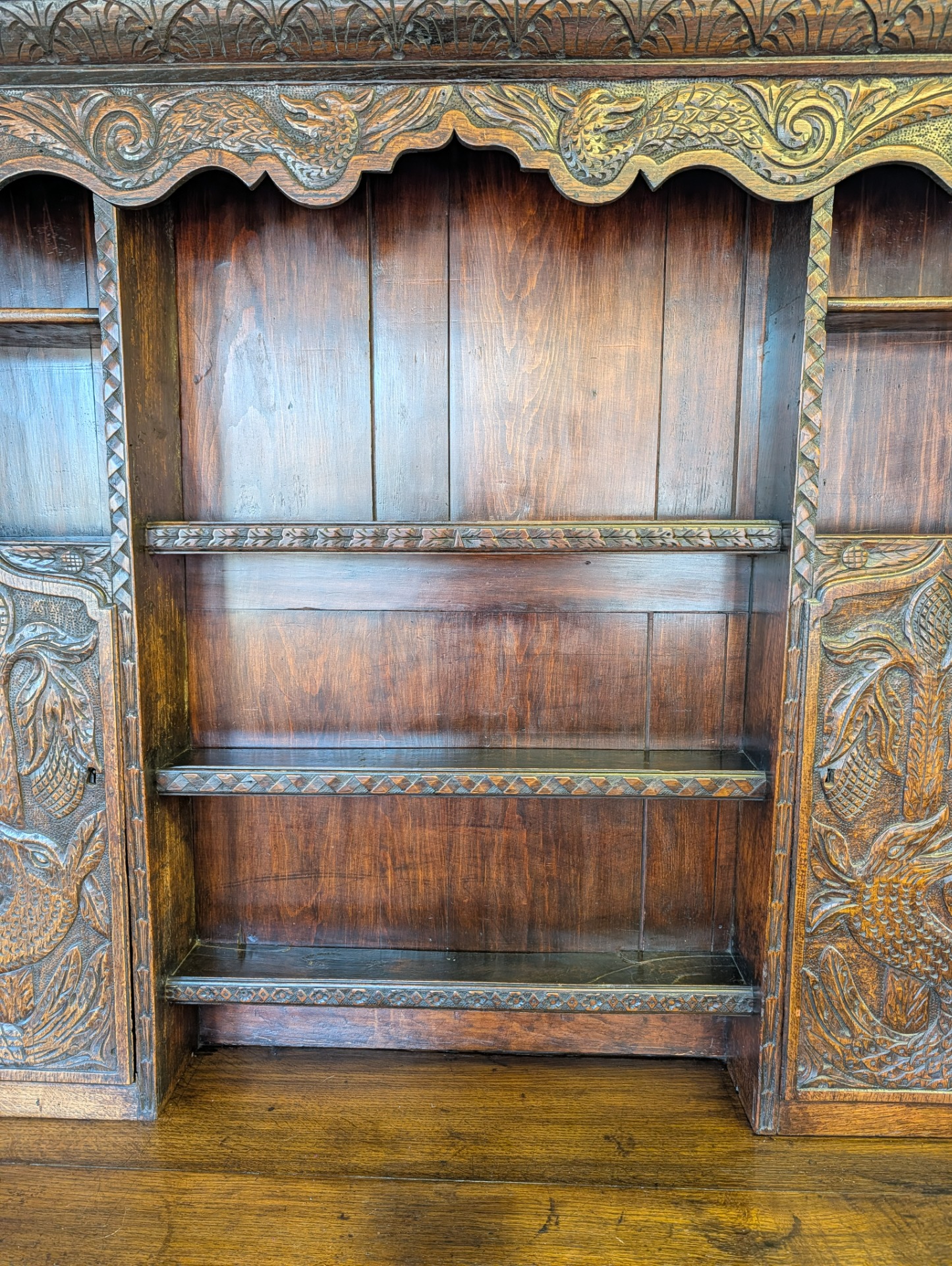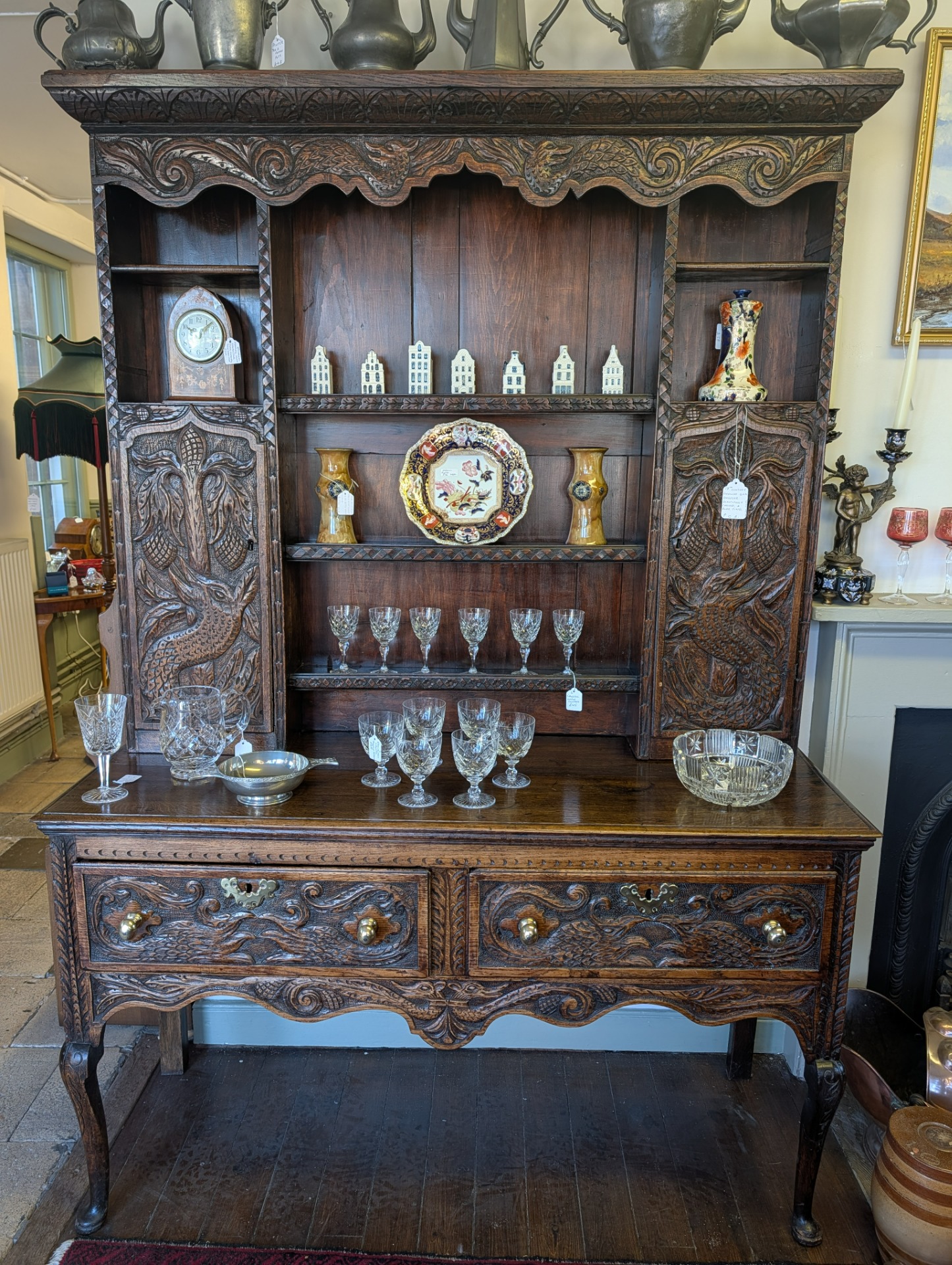 As it is, its a beautiful piece of furniture, in wonderful condition for its 250+ years of age with a deep shine and lovely patina that only time can bring. The unit comes in two pieces, the lower section incorporating two large ornately carved drawers with brass handles, and key holes (no keys or locks for the drawers) above a scalloped frieze. The upper section, with shelves and two cupboards both with locks and keys, provide for additional storage, all below another ornately carved frieze.