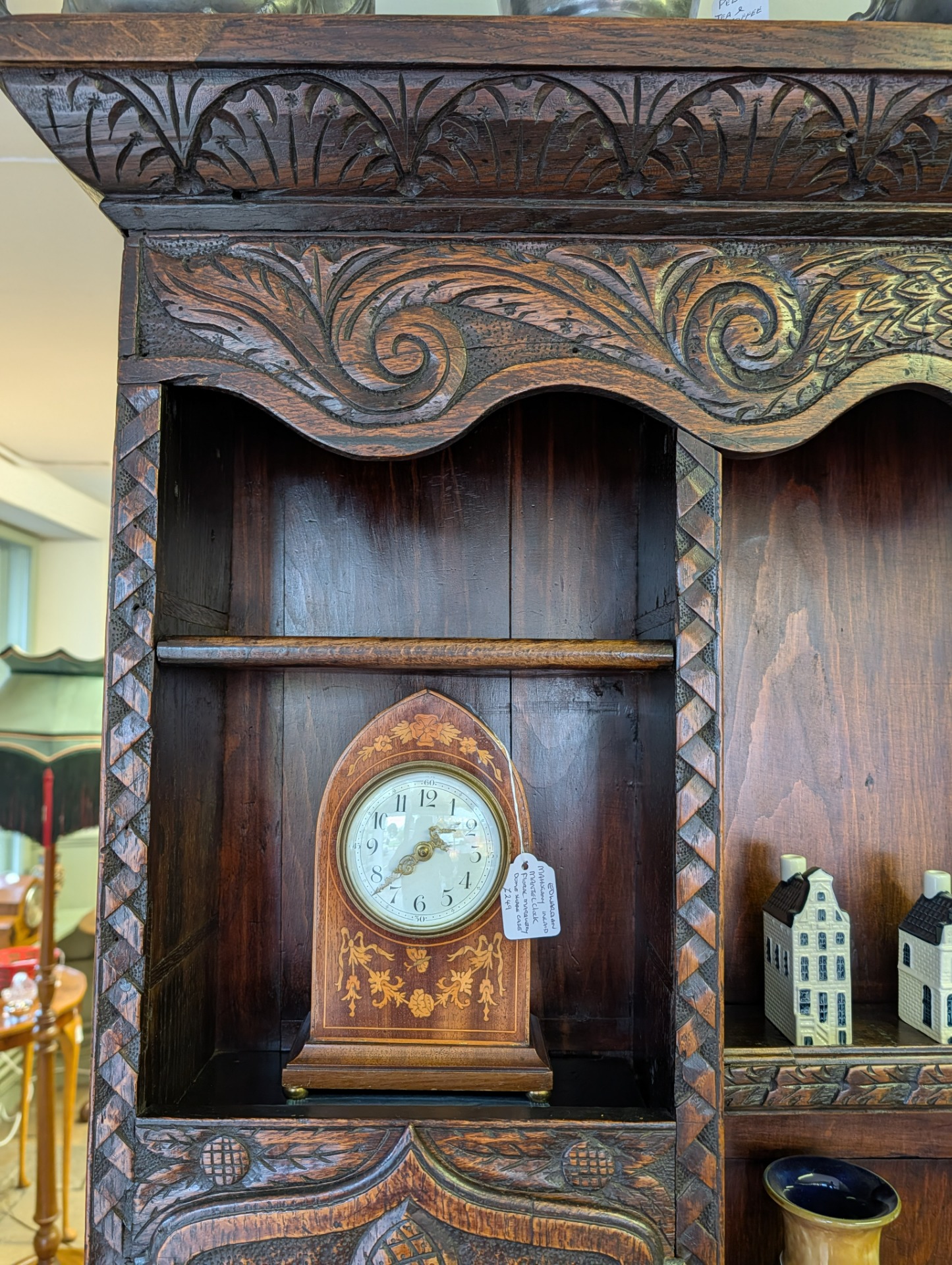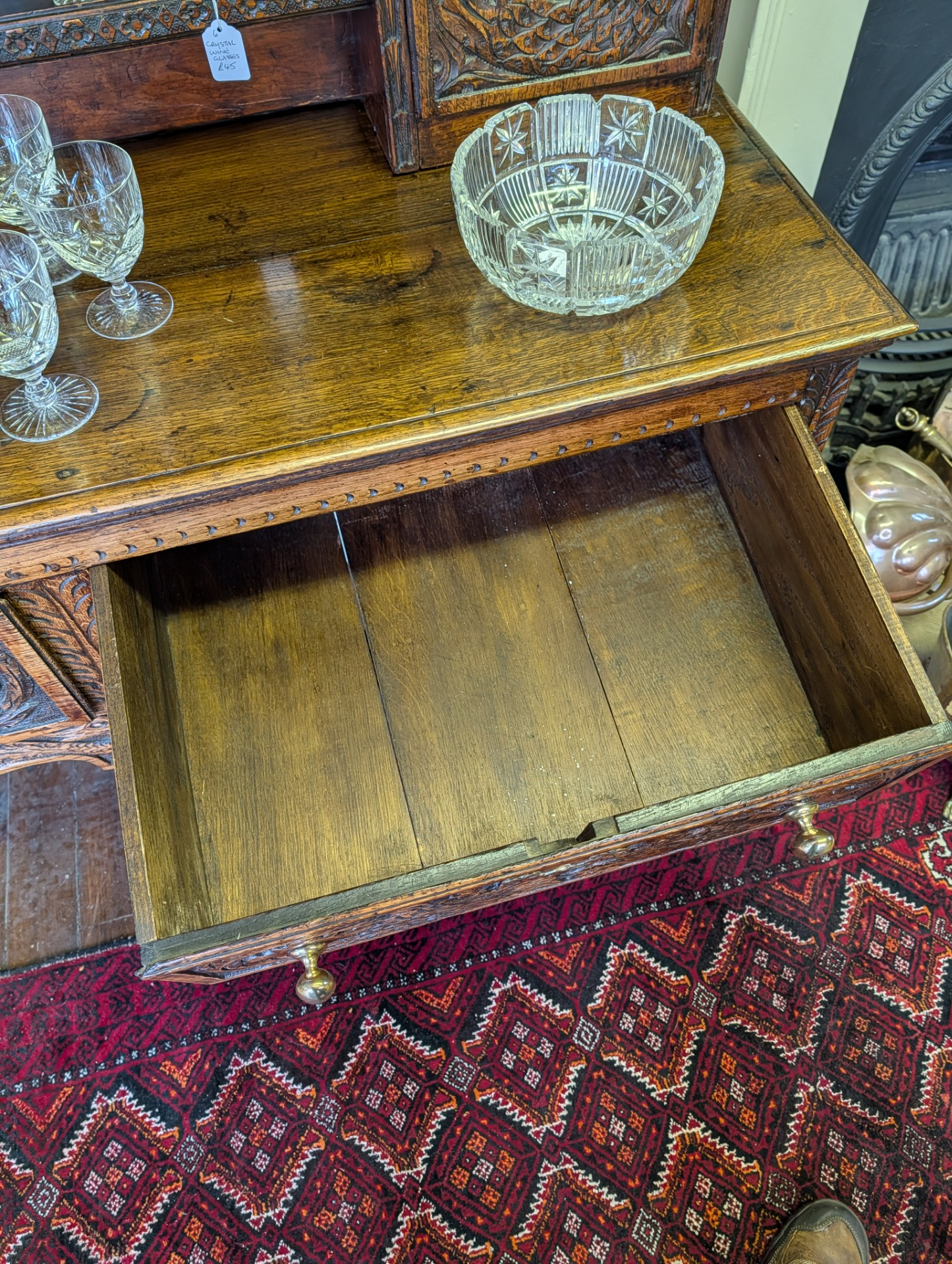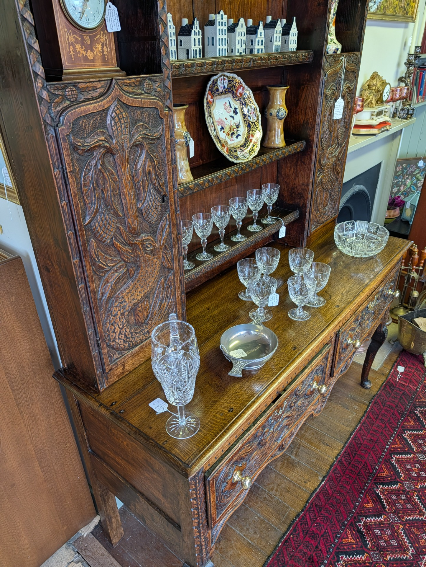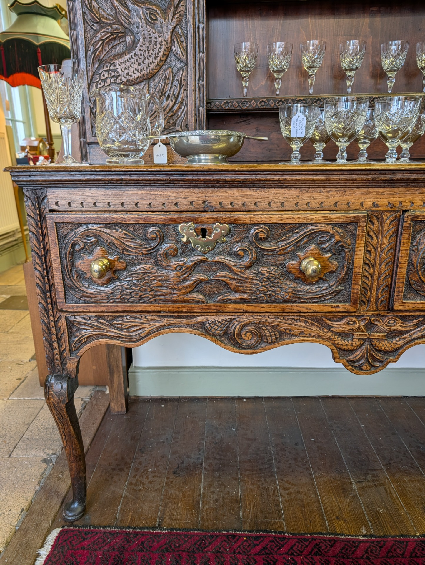 As it is, its a beautiful piece of furniture, in wonderful condition for its 250+ years of age with a deep shine and lovely patina that only time can bring. The unit comes in two pieces, the lower section incorporating two large ornately carved drawers with brass handles, and key holes (no keys or locks for the drawers) above a scalloped frieze. The upper section, with shelves and two cupboards both with locks and keys, provide for additional storage, all below another ornately carved frieze.