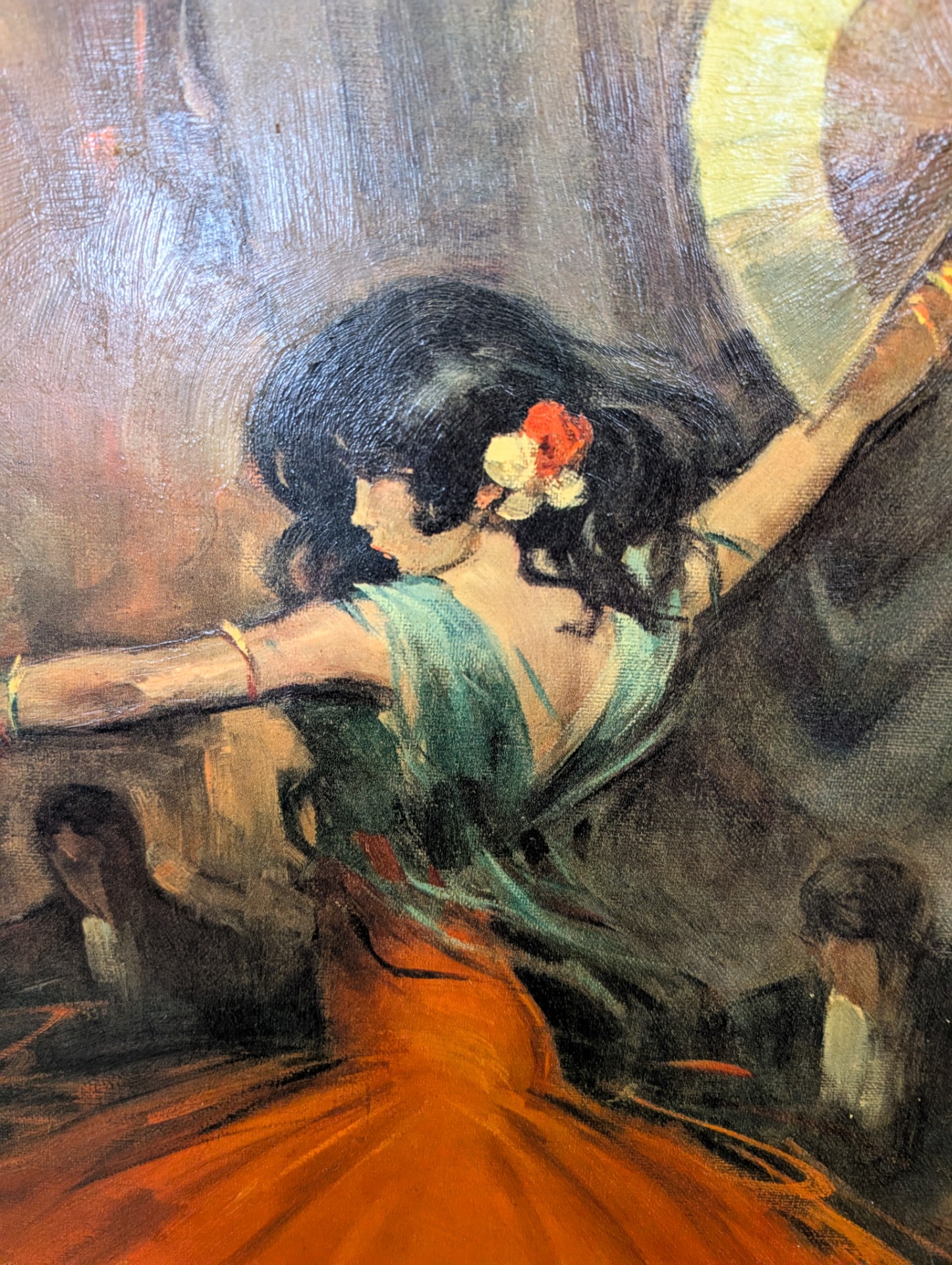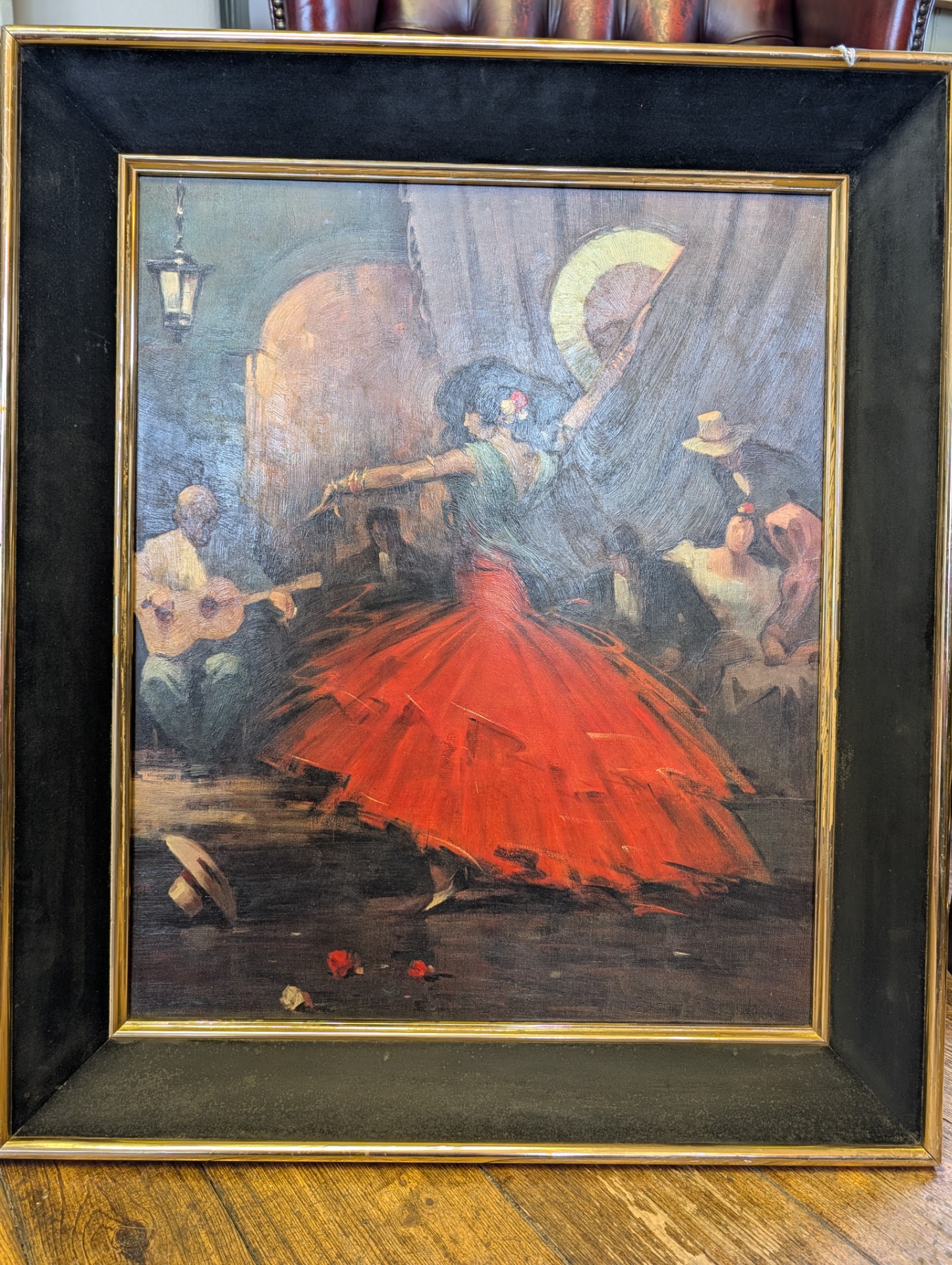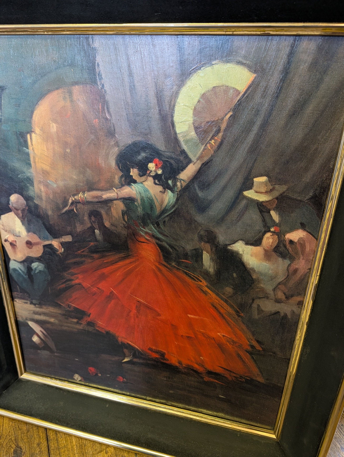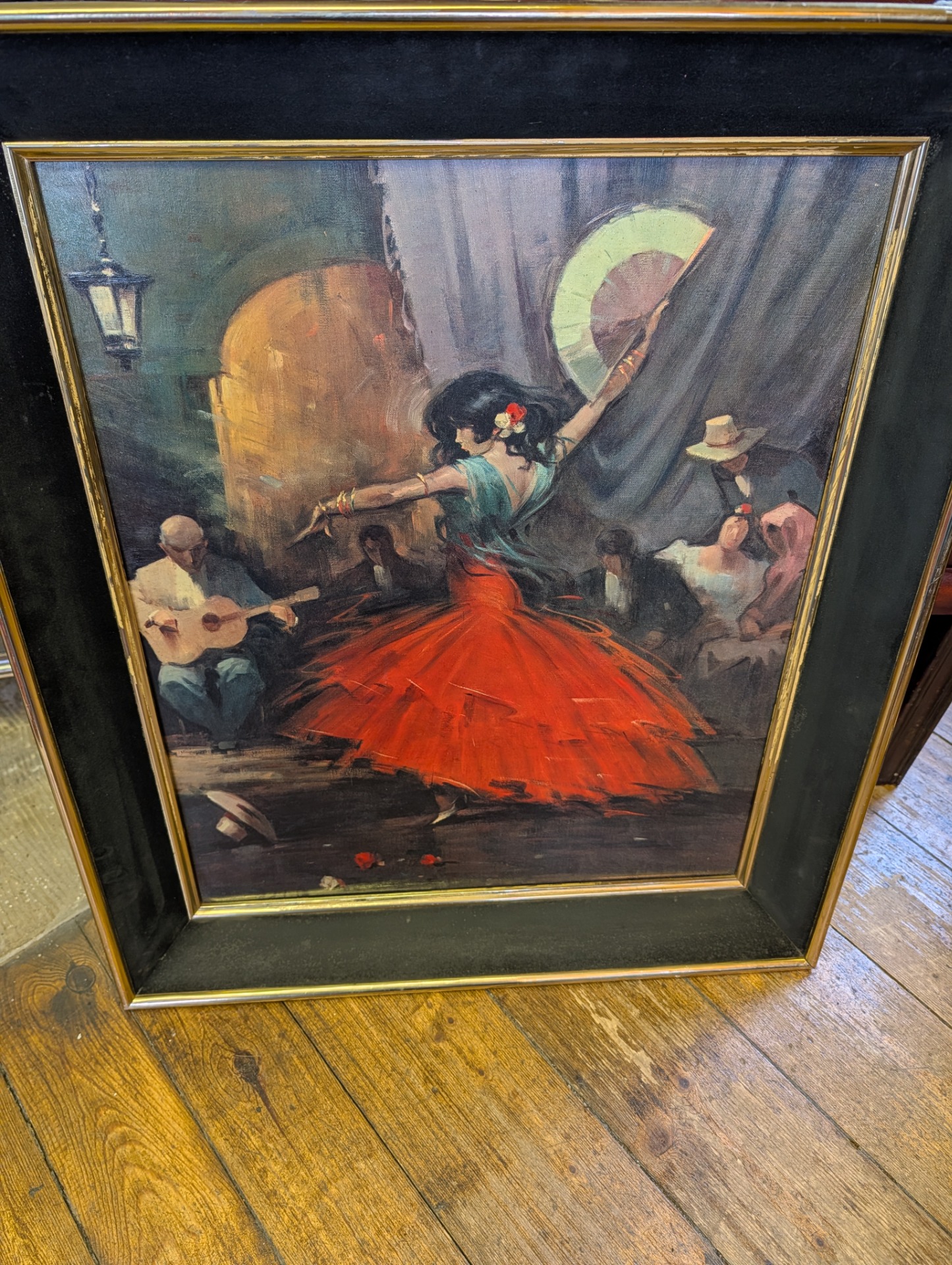 This is a 1962 reproduction of Juan Giralt Lerin's Spanish Dance, hand finished oil on board. It is technically a print or lithograph but you would be very hard pressed to tell, there is so much attention to detail. The picture measures 60cm x 70cm including the wooden frame, image size is 47cm x 57cm.