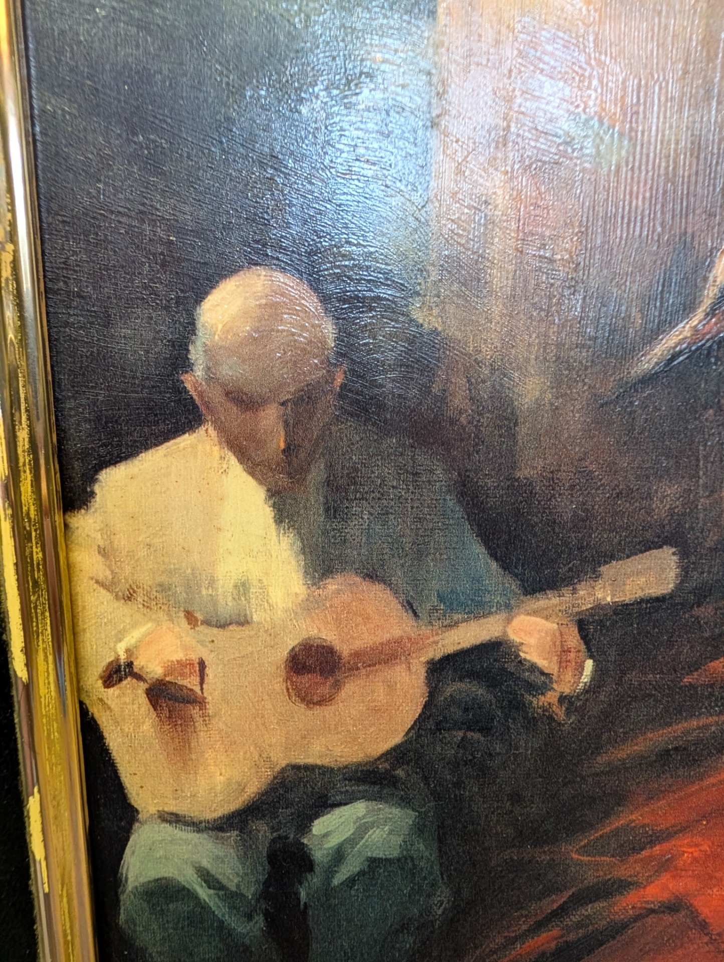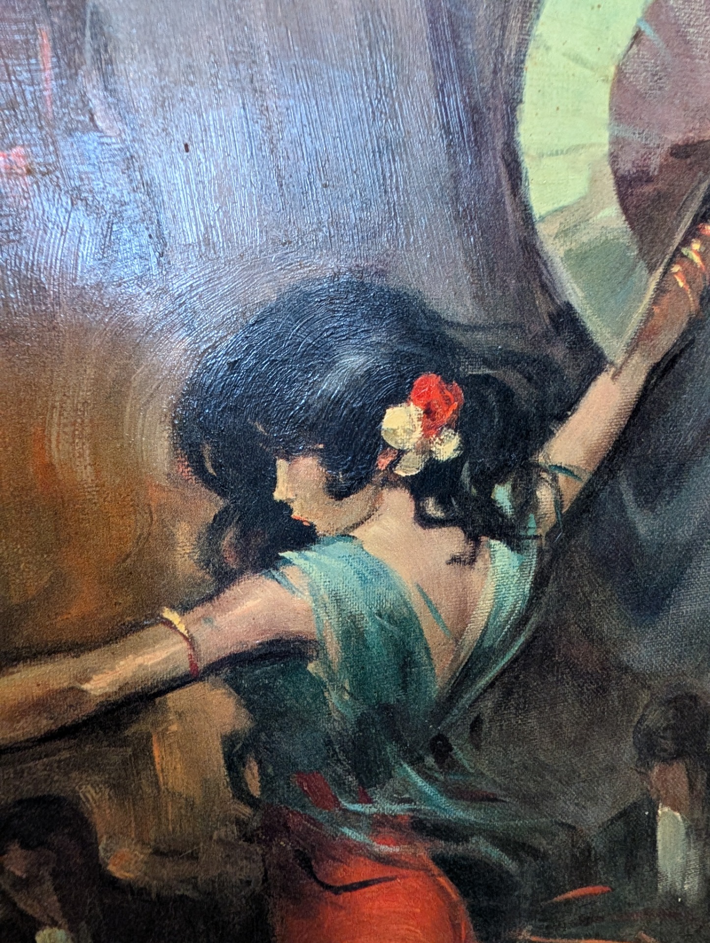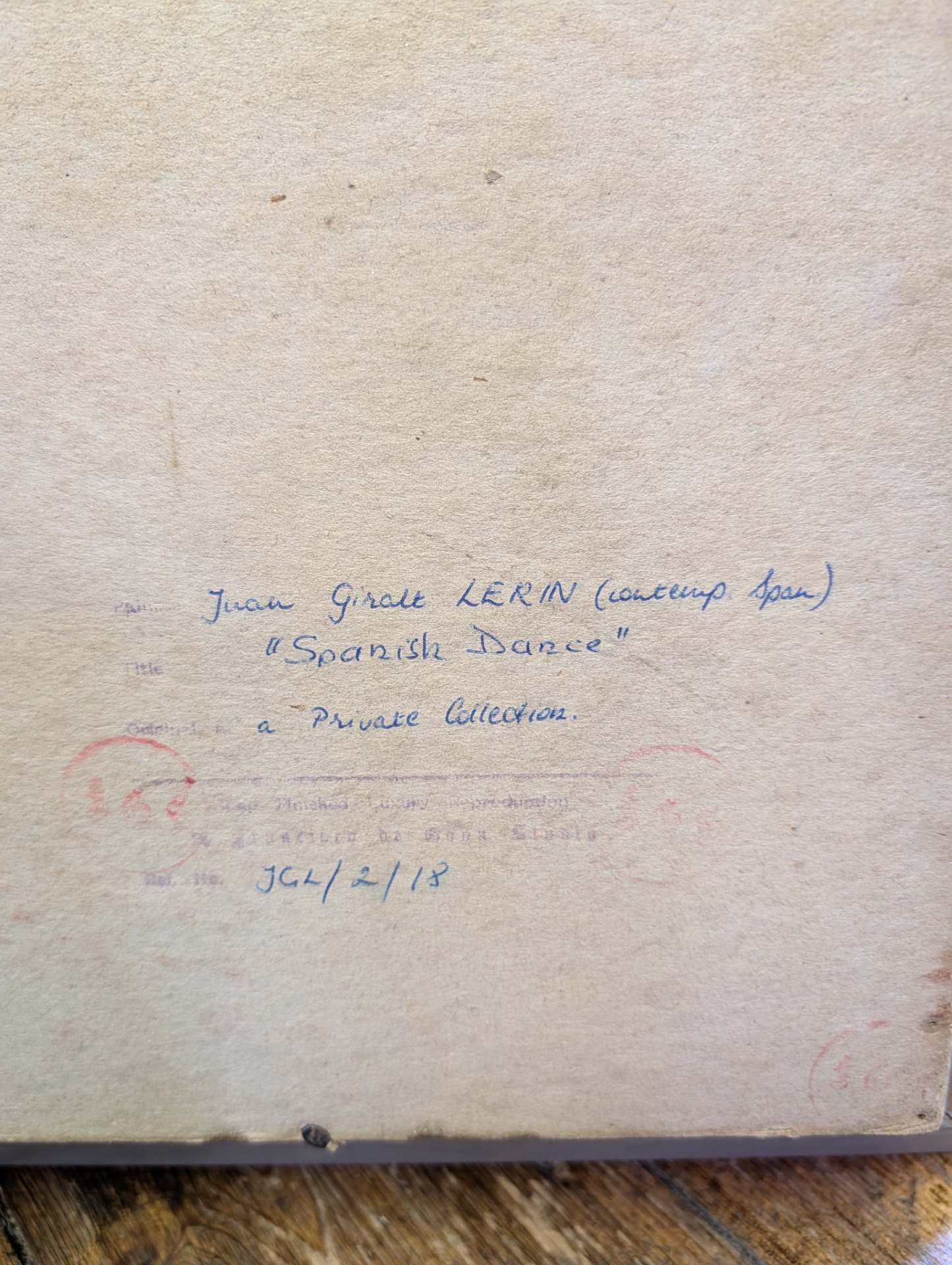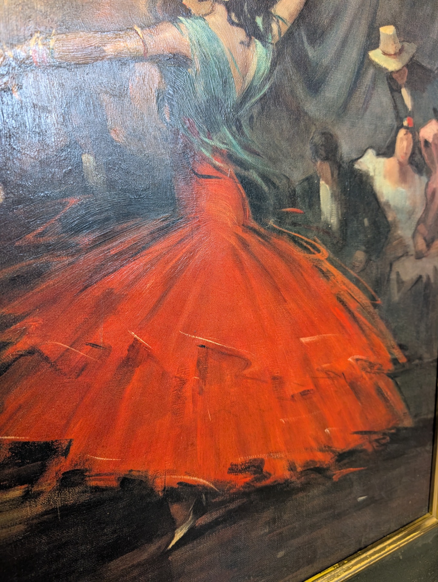 This is a 1962 reproduction of Juan Giralt Lerin's Spanish Dance, hand finished oil on board. It is technically a print or lithograph but you would be very hard pressed to tell, there is so much attention to detail. The picture measures 60cm x 70cm including the wooden frame, image size is 47cm x 57cm.