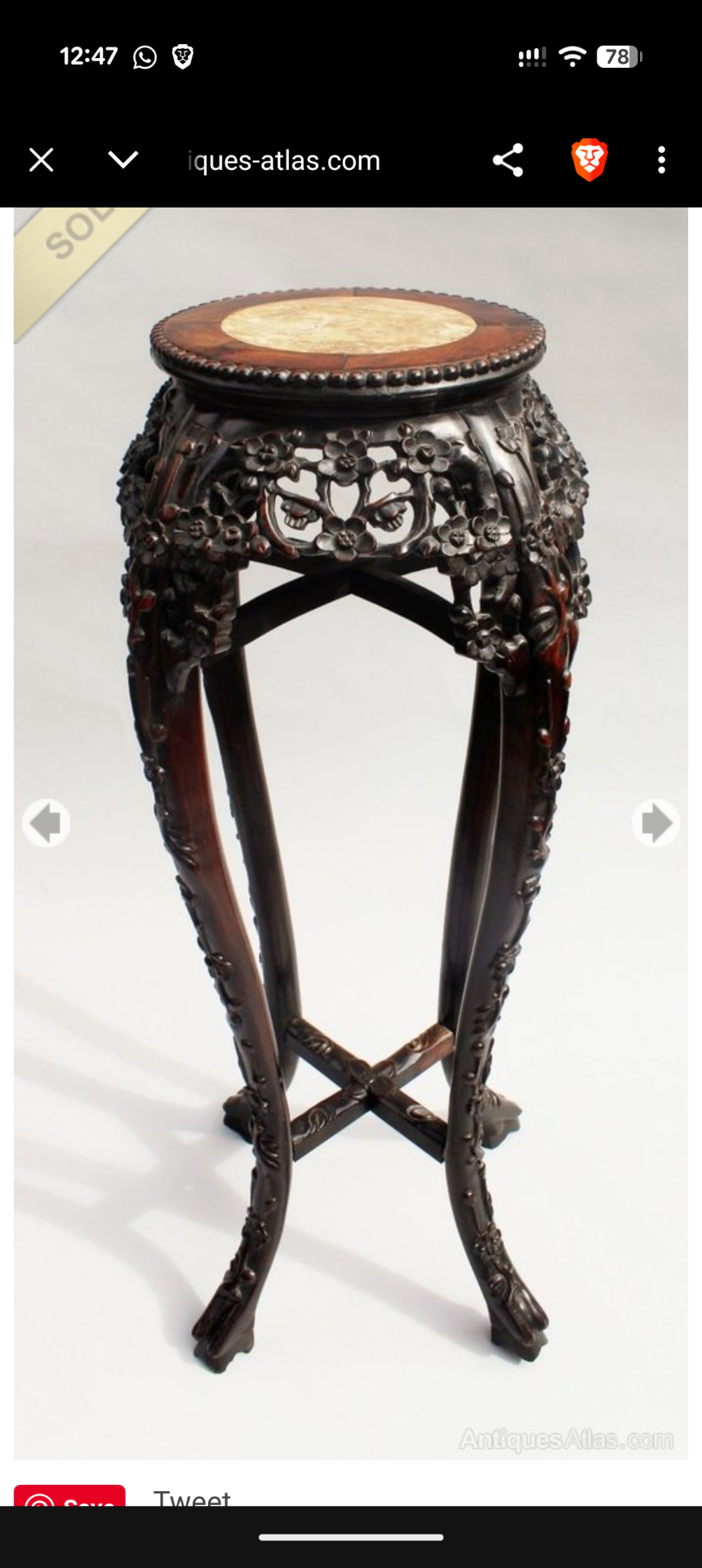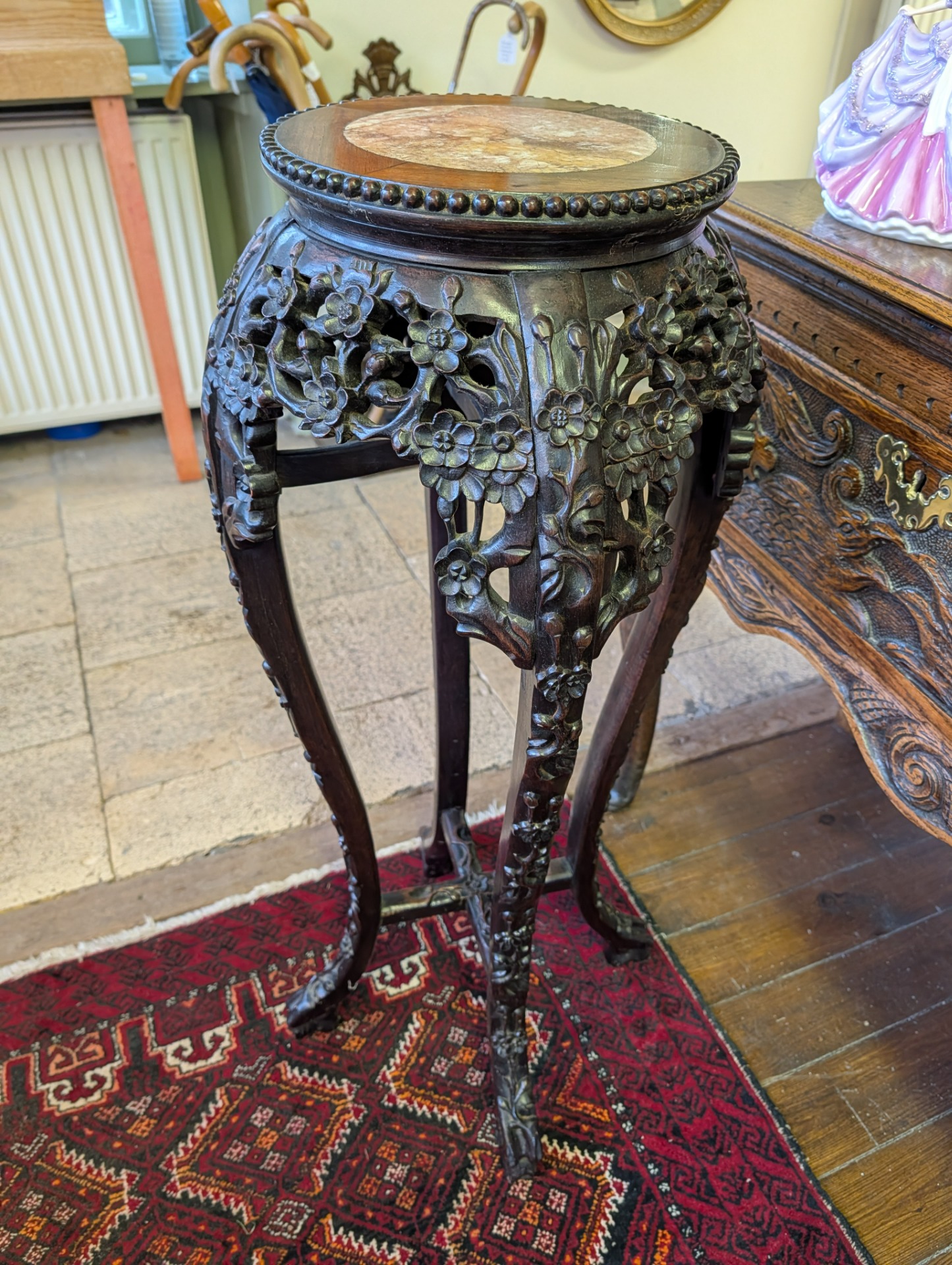 An Elegant 19th century Chinese Hardwood stand carved with blossom and incorporating a Sienna marble top, the stand is in excellent condition and would make a fabulous addition to any room. Measures 92cm high x 40cm in diameter, the top is 27cm.