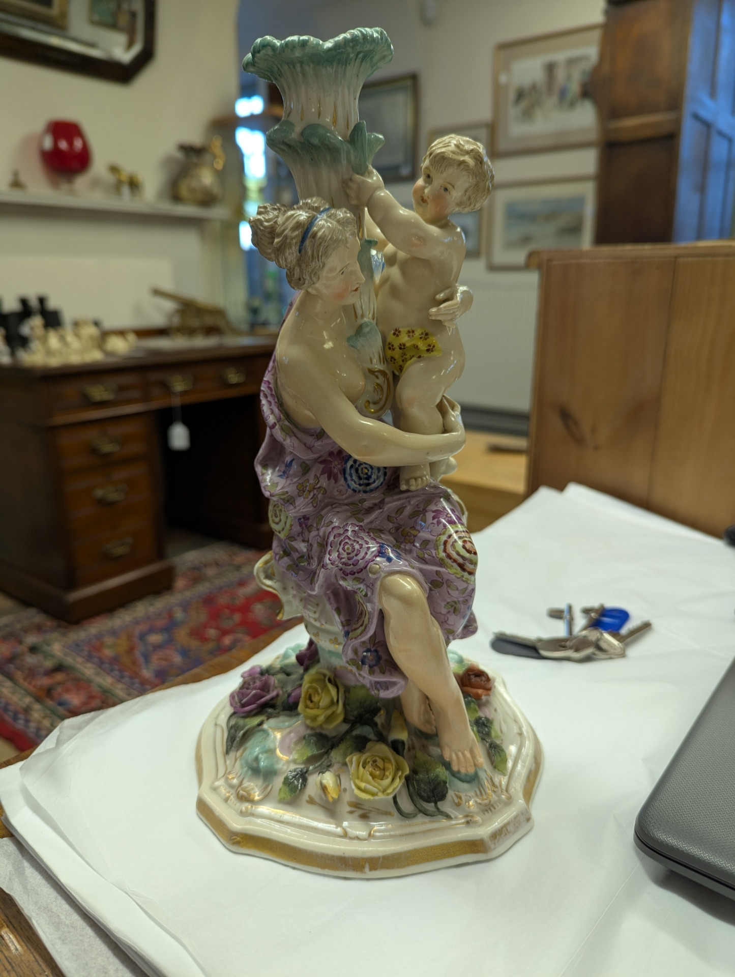 A early 19th century Mother and child candlestick of Meissen style and from a Dresden Pottery works, in excellent condition.