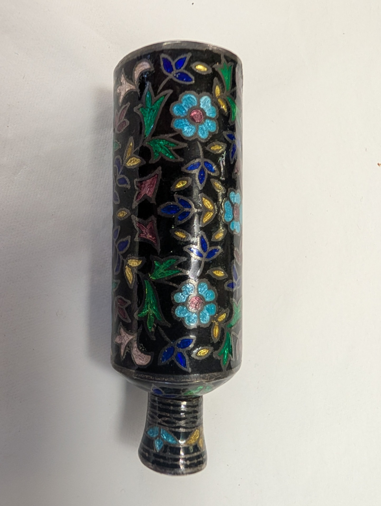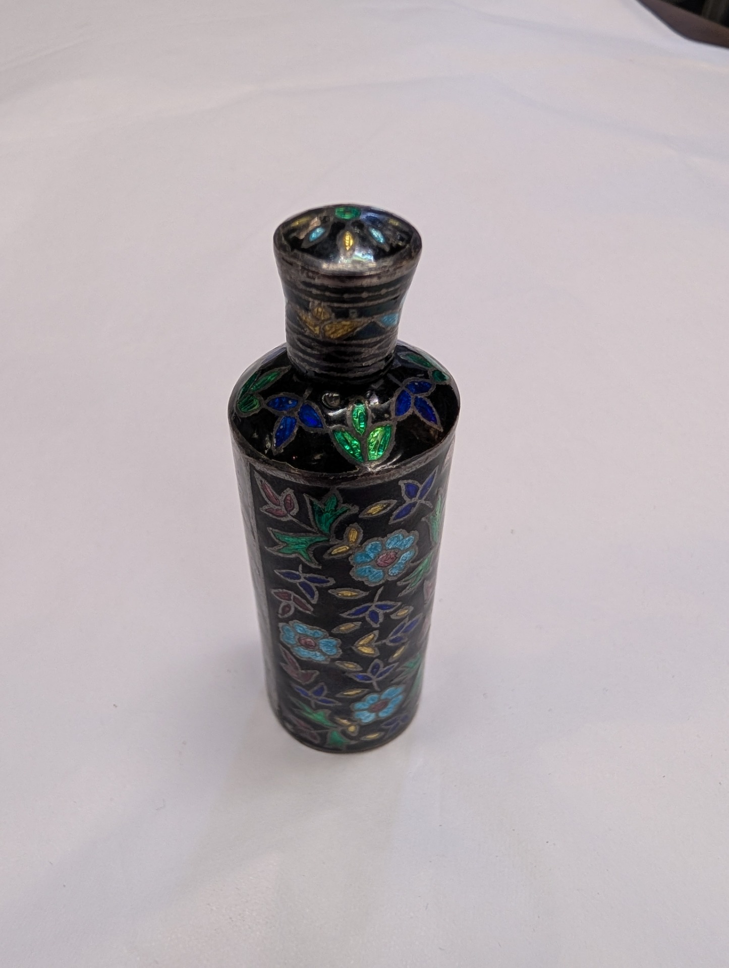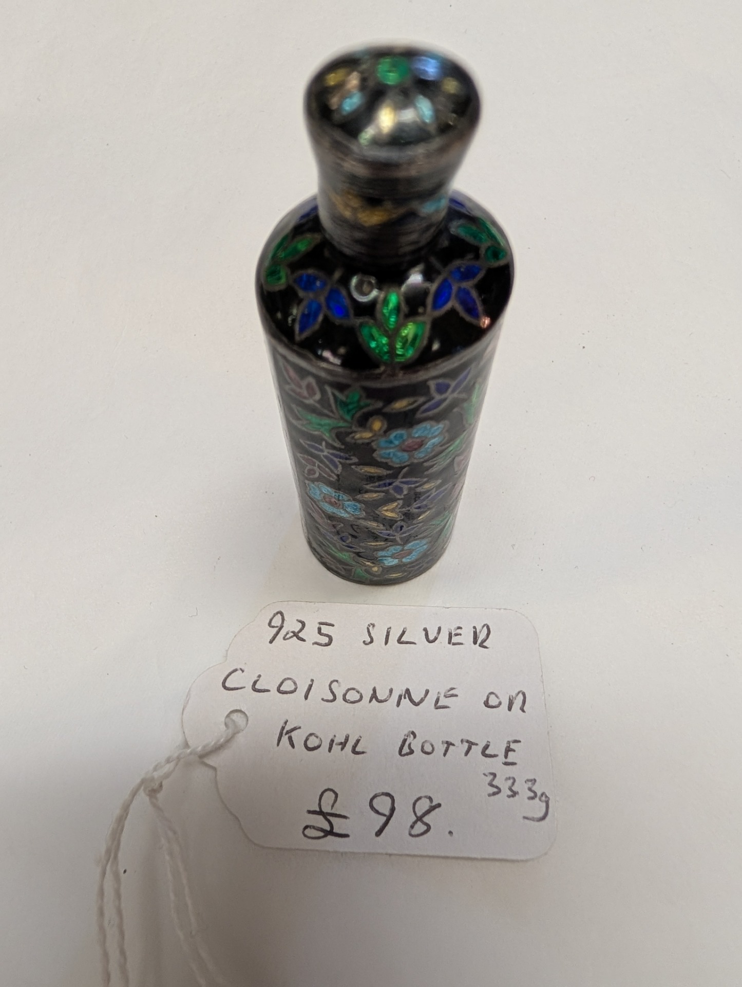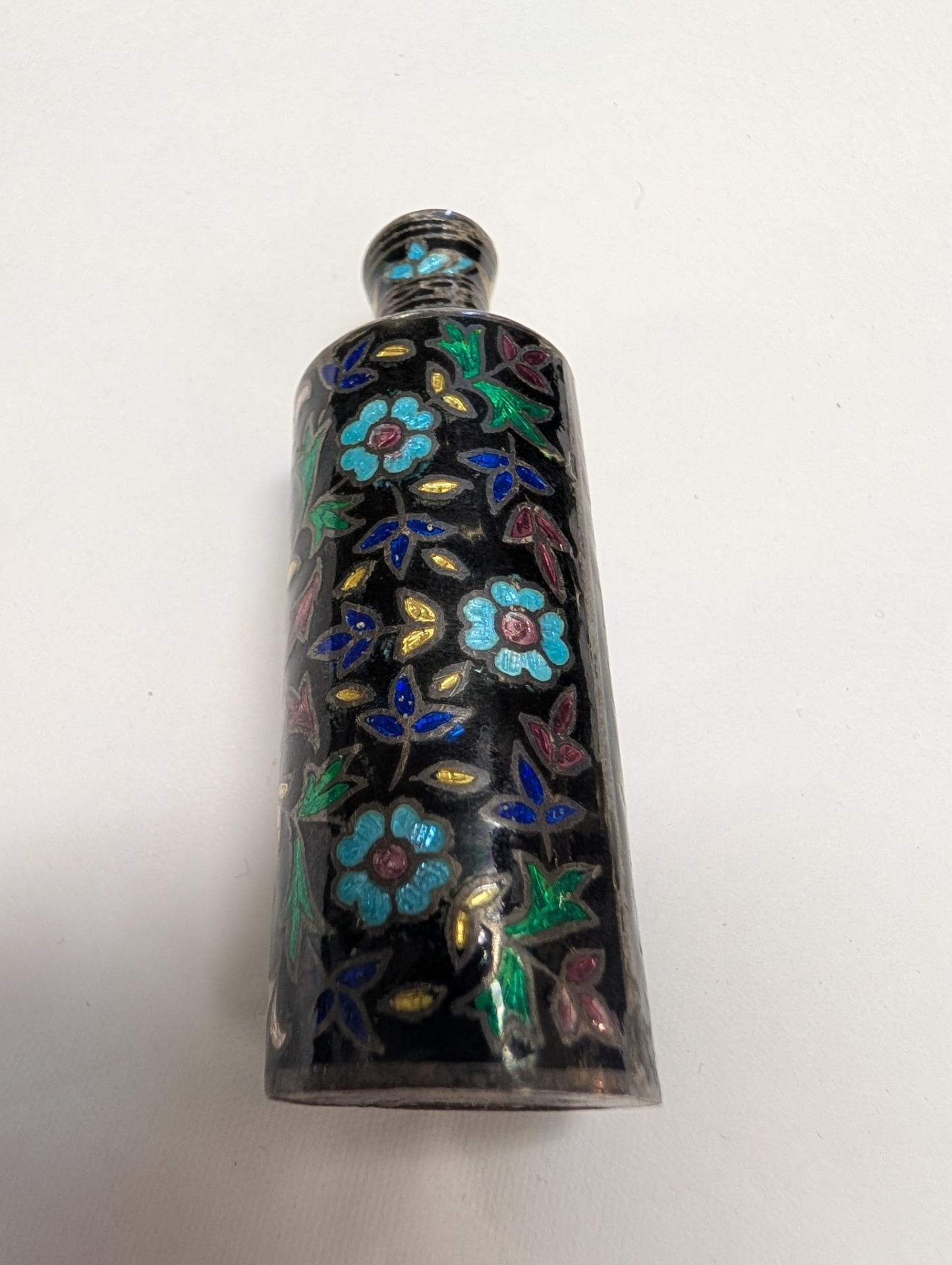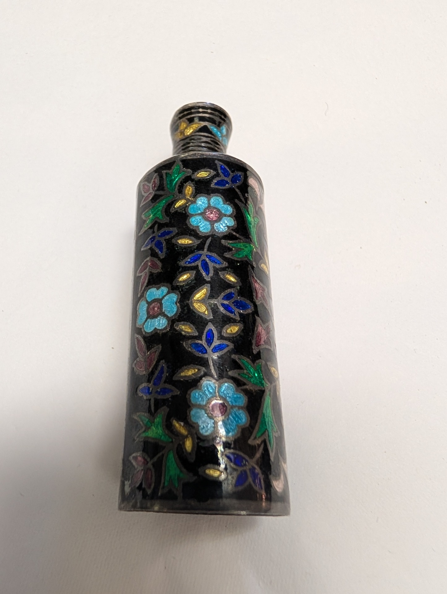 A beautifully coloured 925 Silver Enamelled Cloisonne or Kohl Bottle, with a screw off cap.