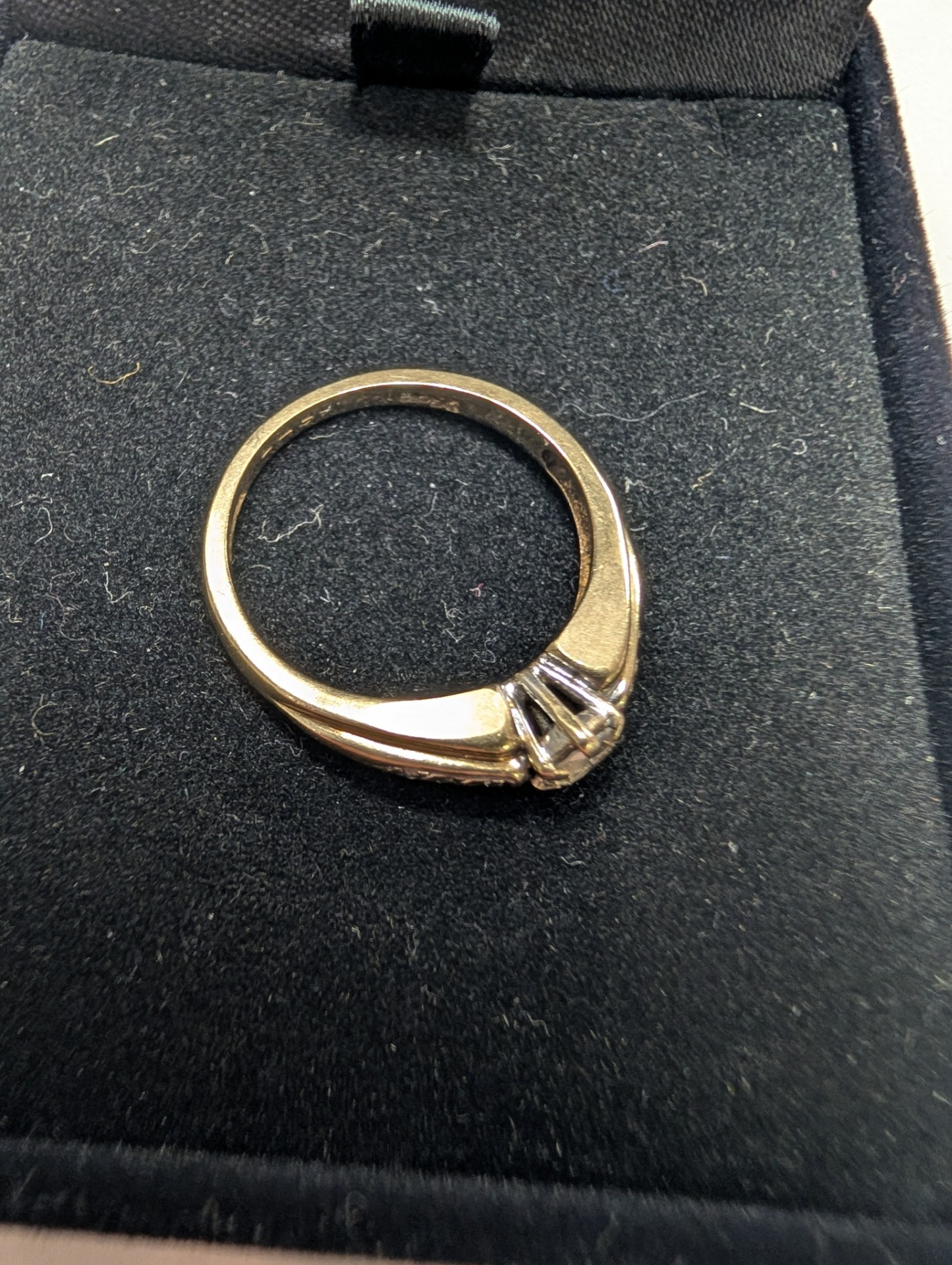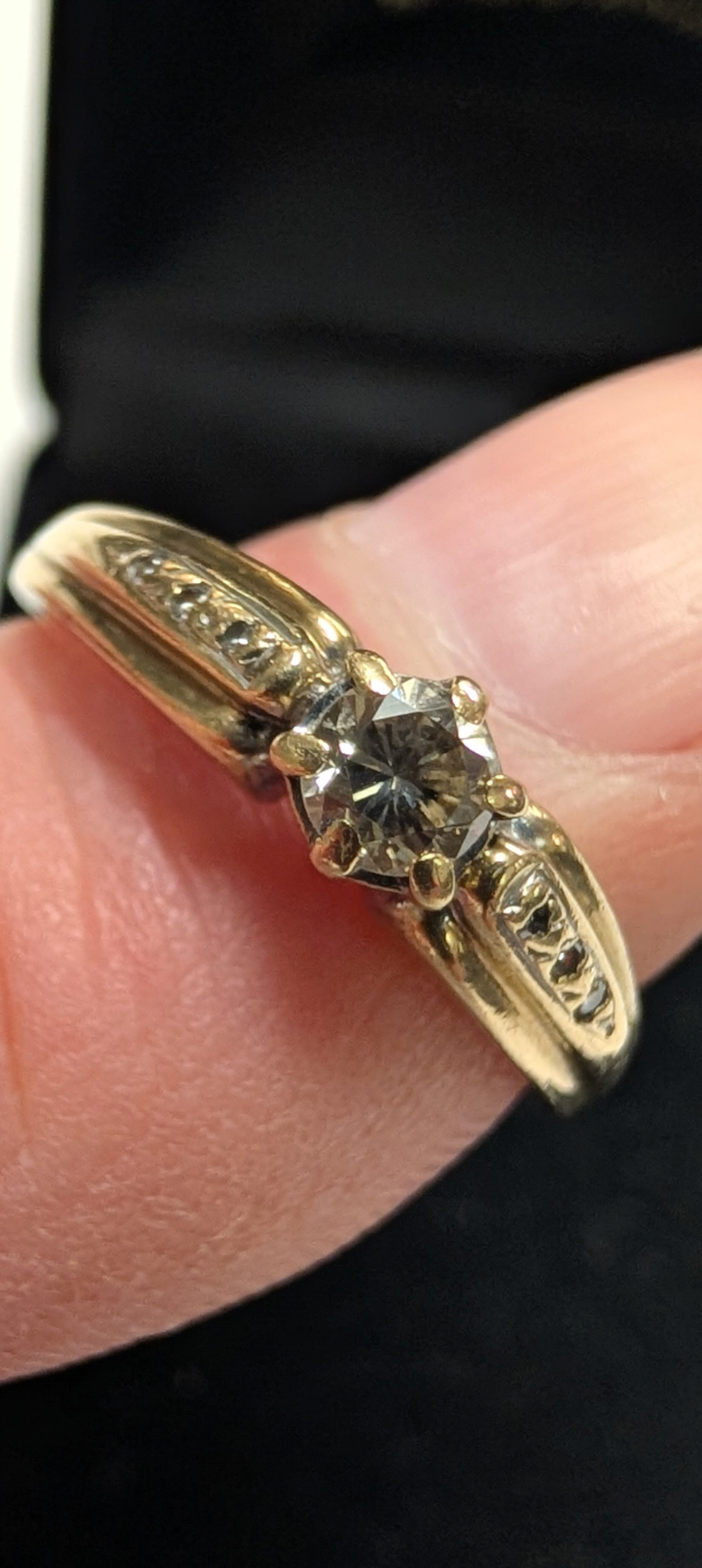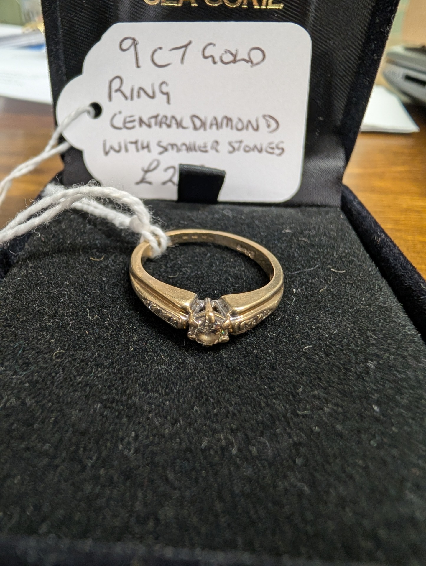 A 9ct gold Diamond ring with smaller stones to the shoulders.