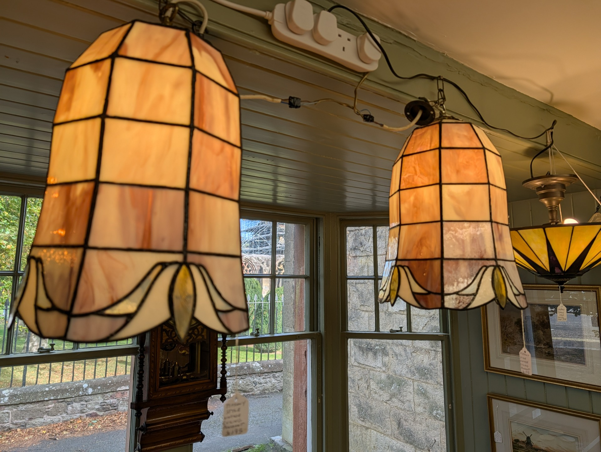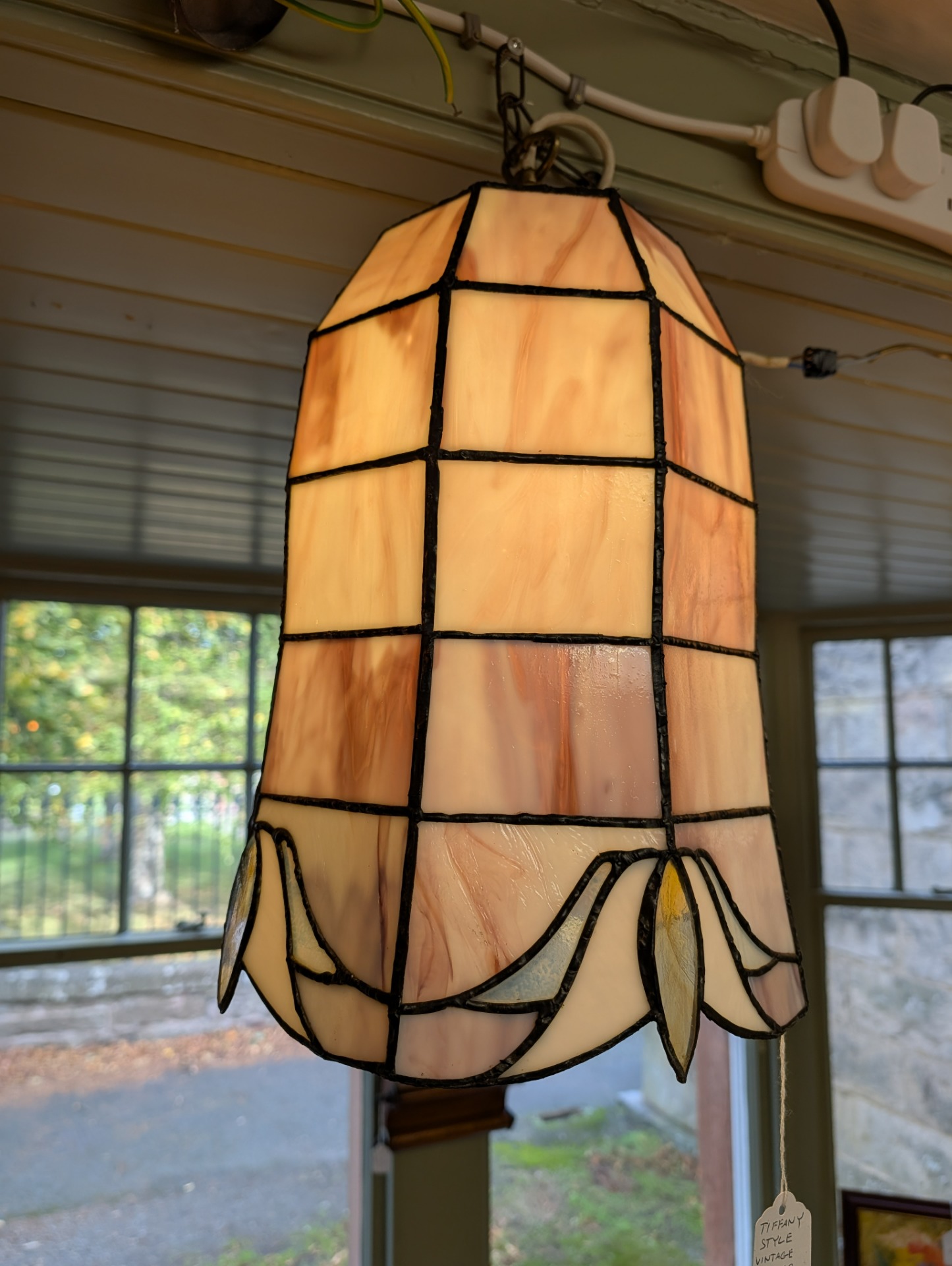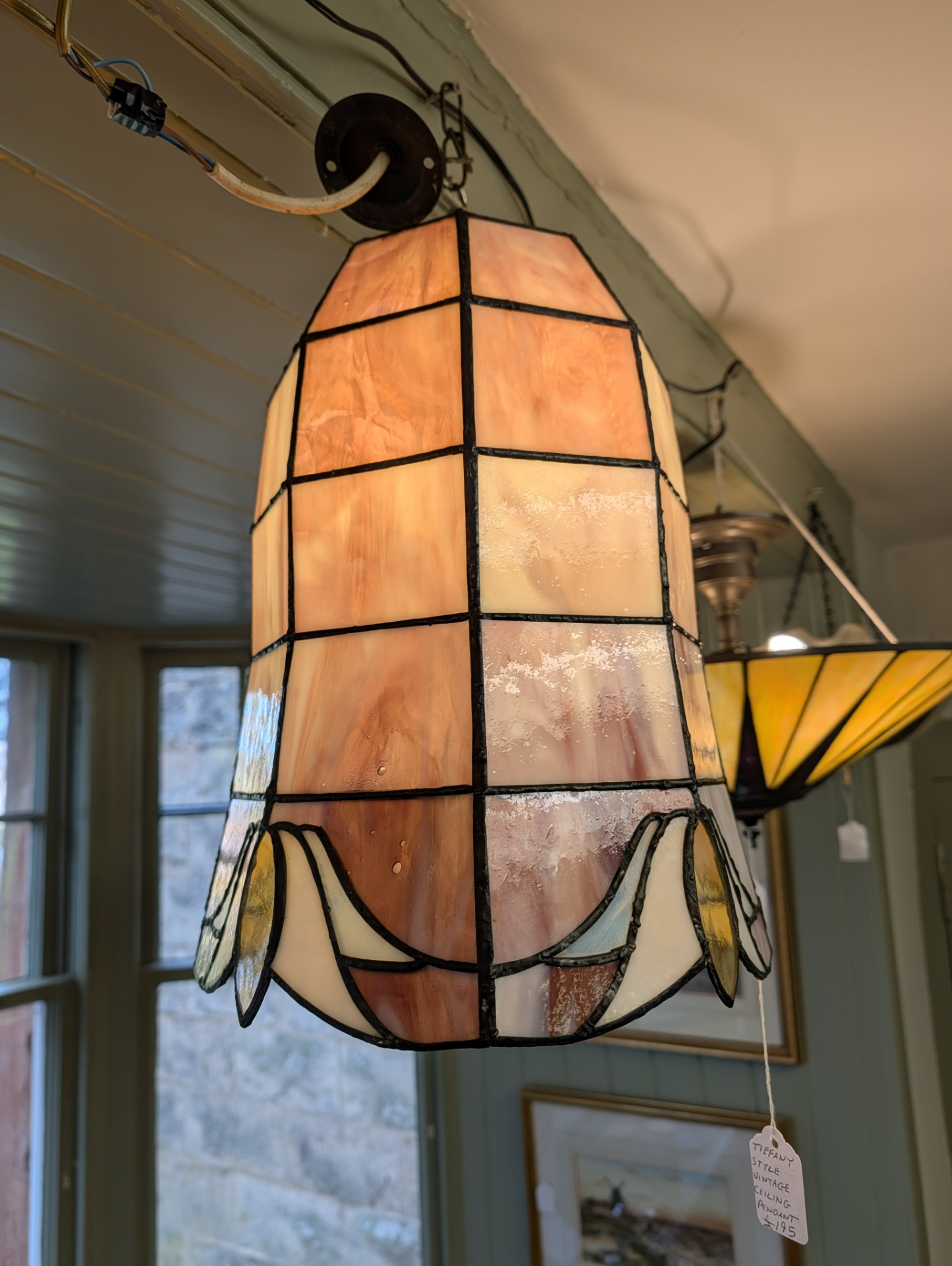 A vintage pair of Tiffany style glass ceiling pendants in shades of lemon white through pink, both in perfect condition, ideal for a hallway or landing and adding a classic touch. Measurements are 40cm long x 27 wide. Any questions just ask, delivery available.
