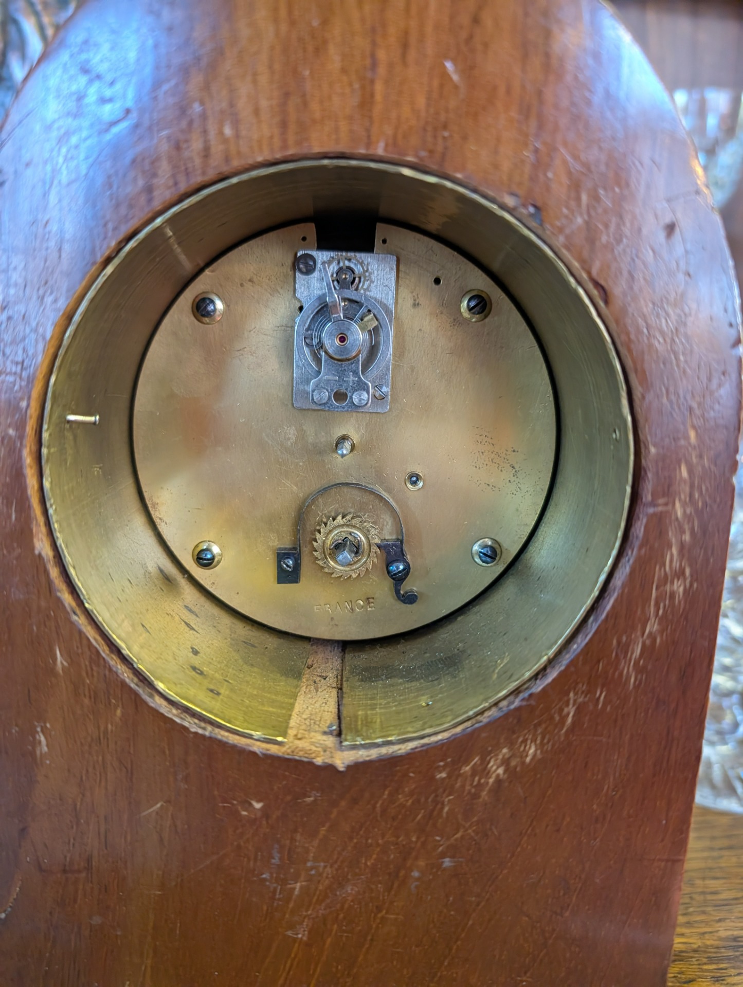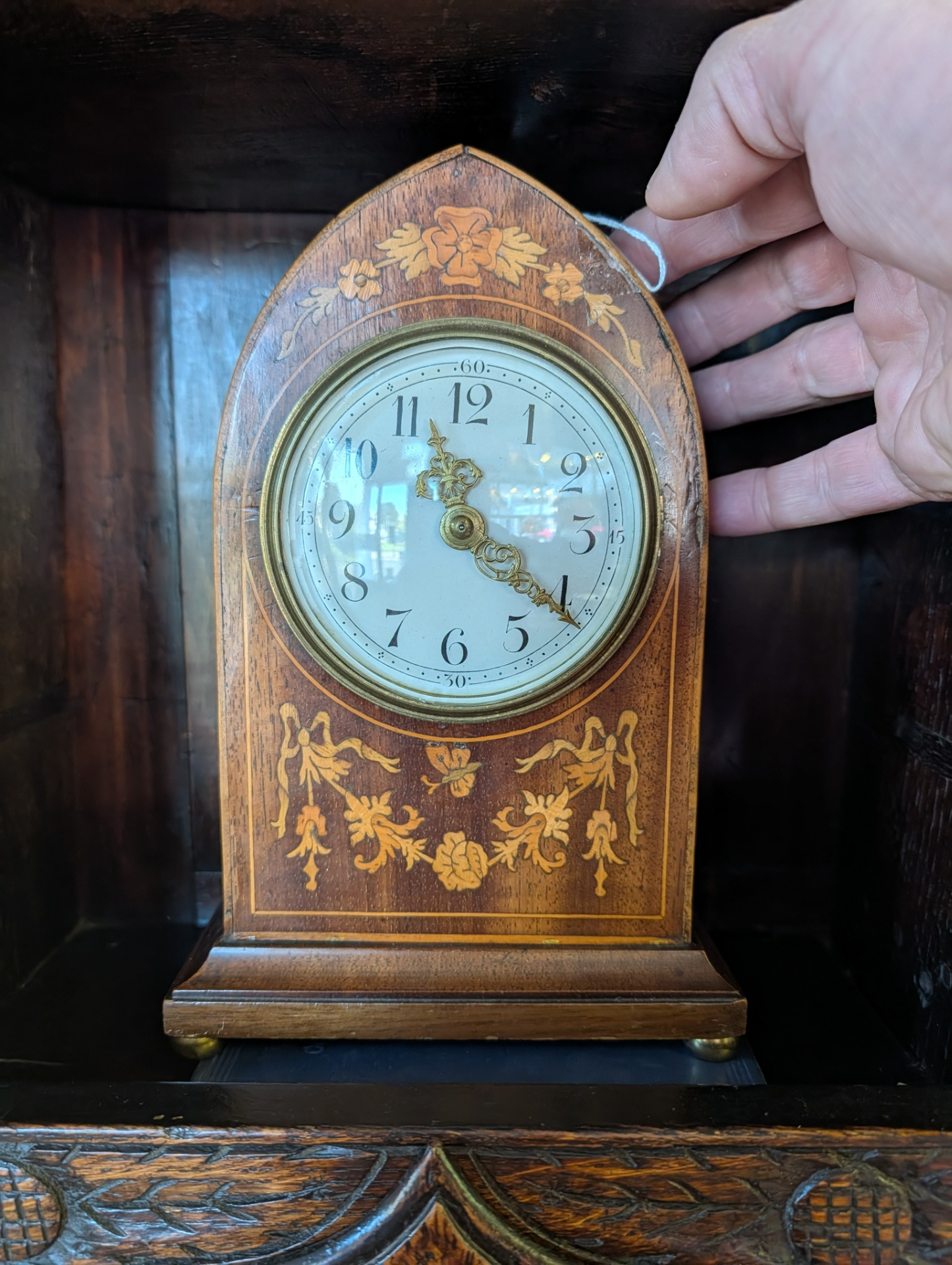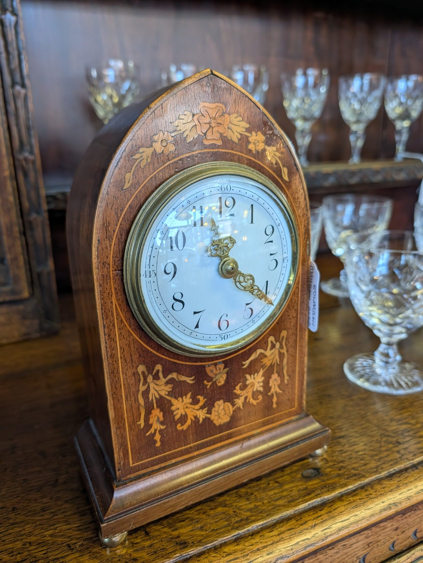 Edwardian Mahogany Mantel clock with French 8 day movement in a beautiful domed case, decorated with floral marquetry. The clock runs really well, and comes with the original key. Any questions just ask, delivery available. Measures 15cm wide x 8 cm deep x 23cm high.