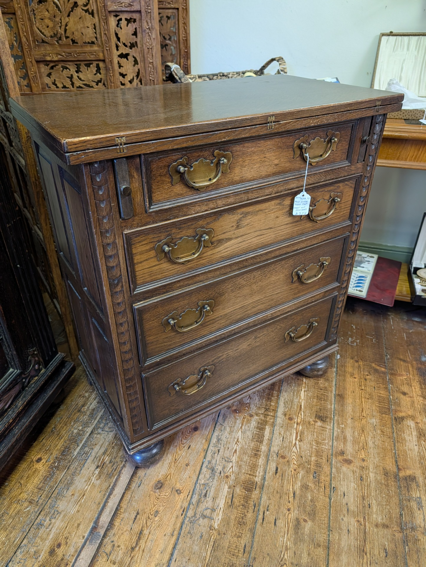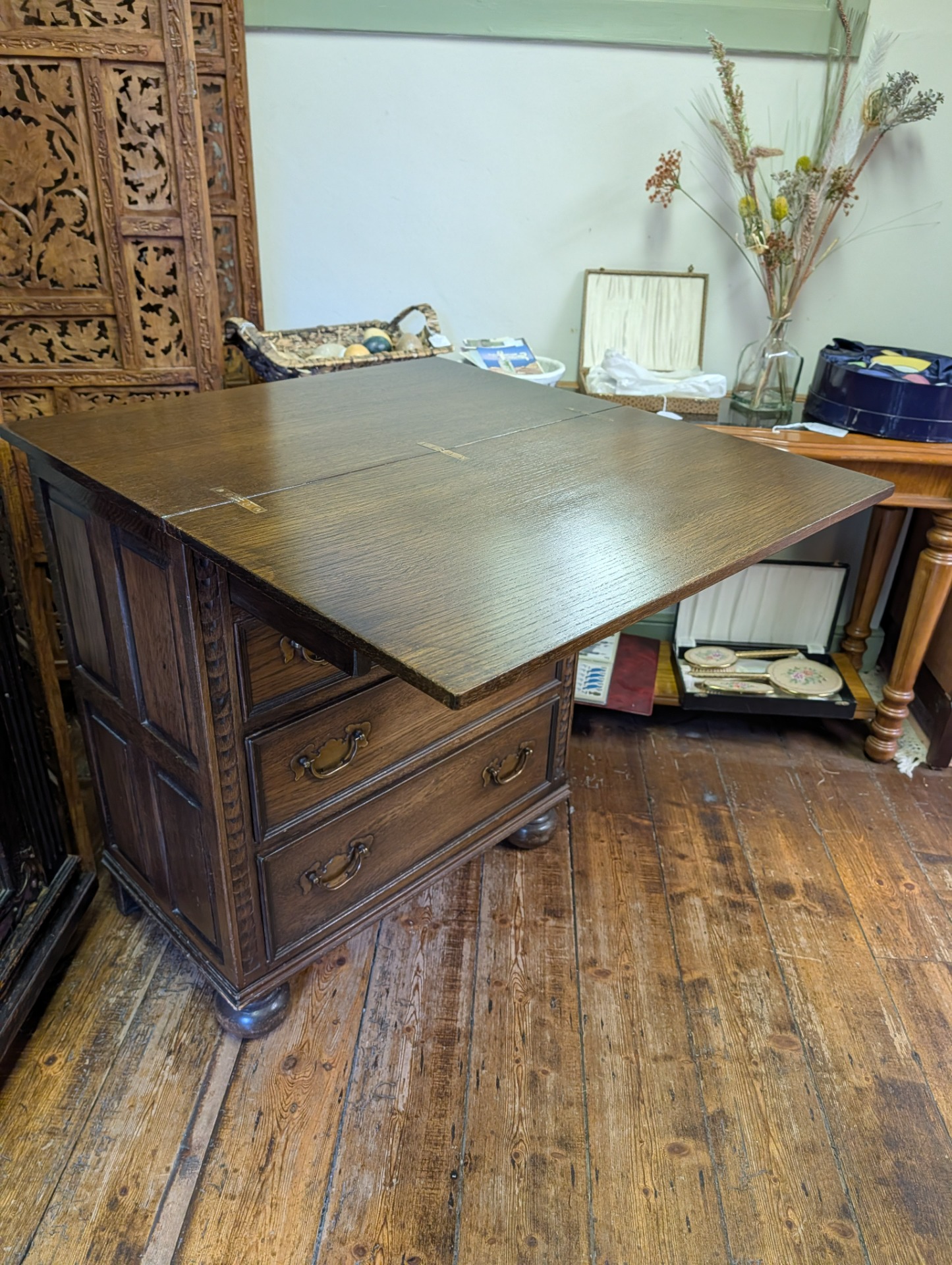 A rare small arts and crafts Oak chest of 4 drawers with the addition of a fold over table top, offering both storage and practicality, especially if space is limited.