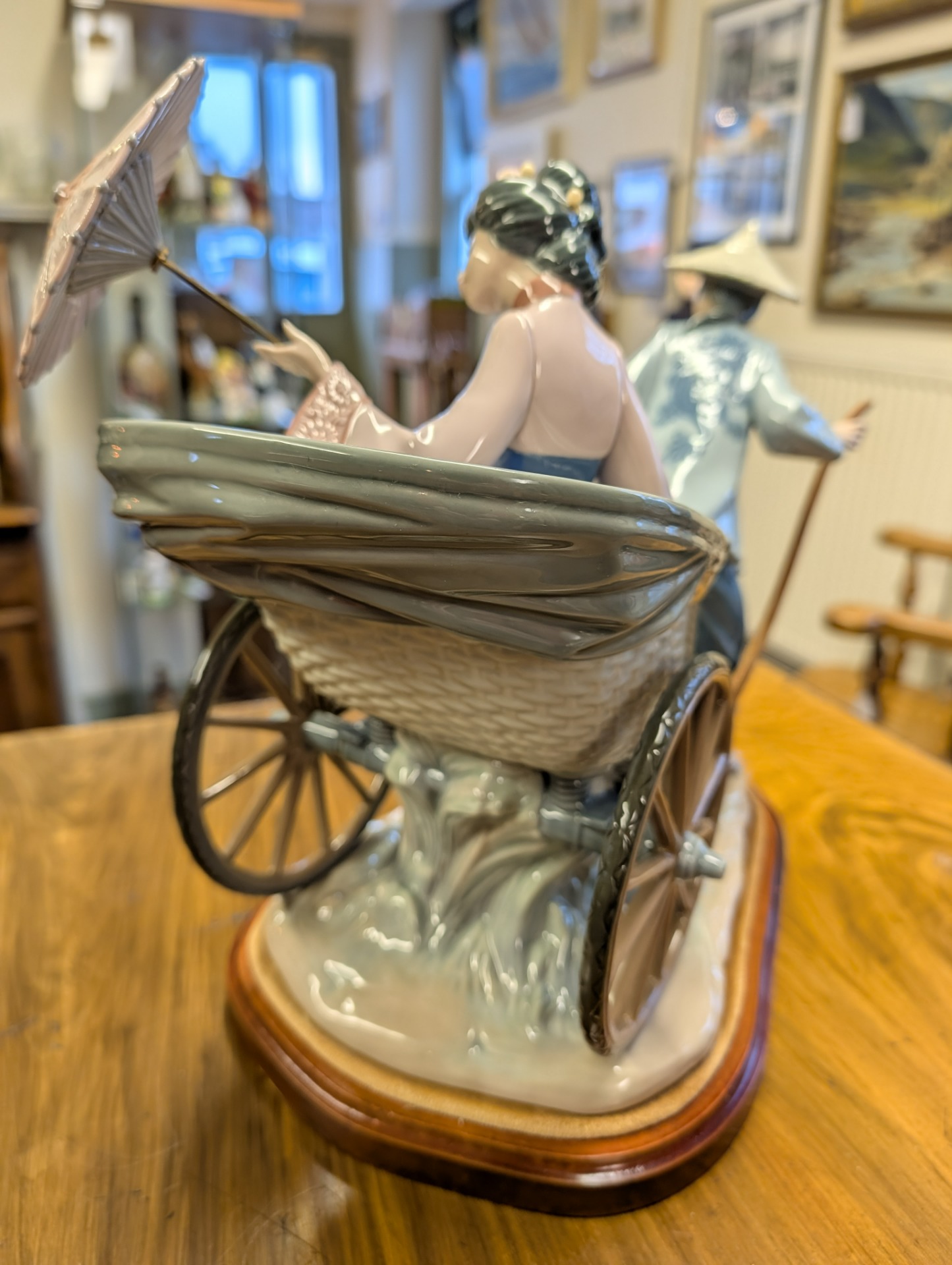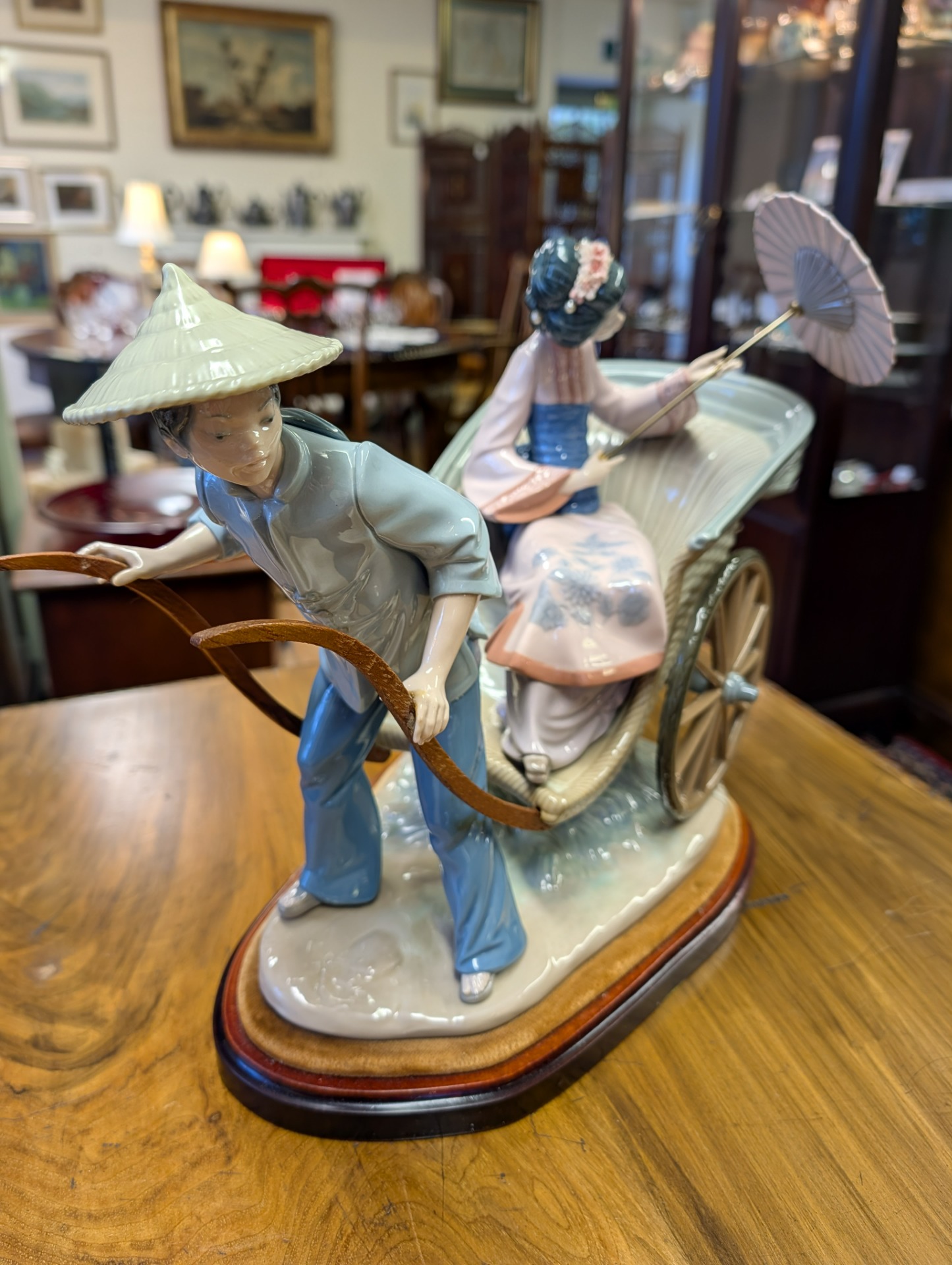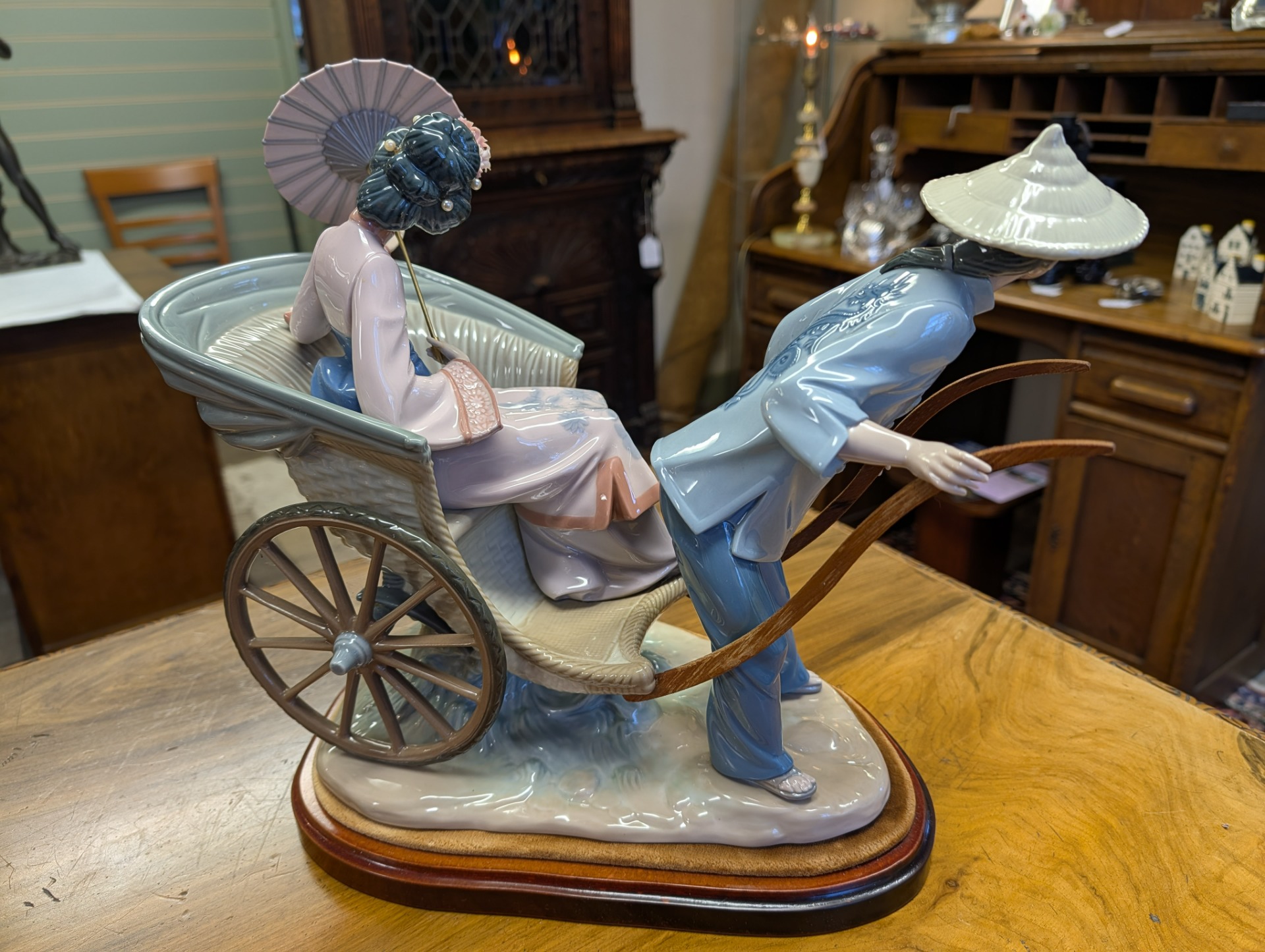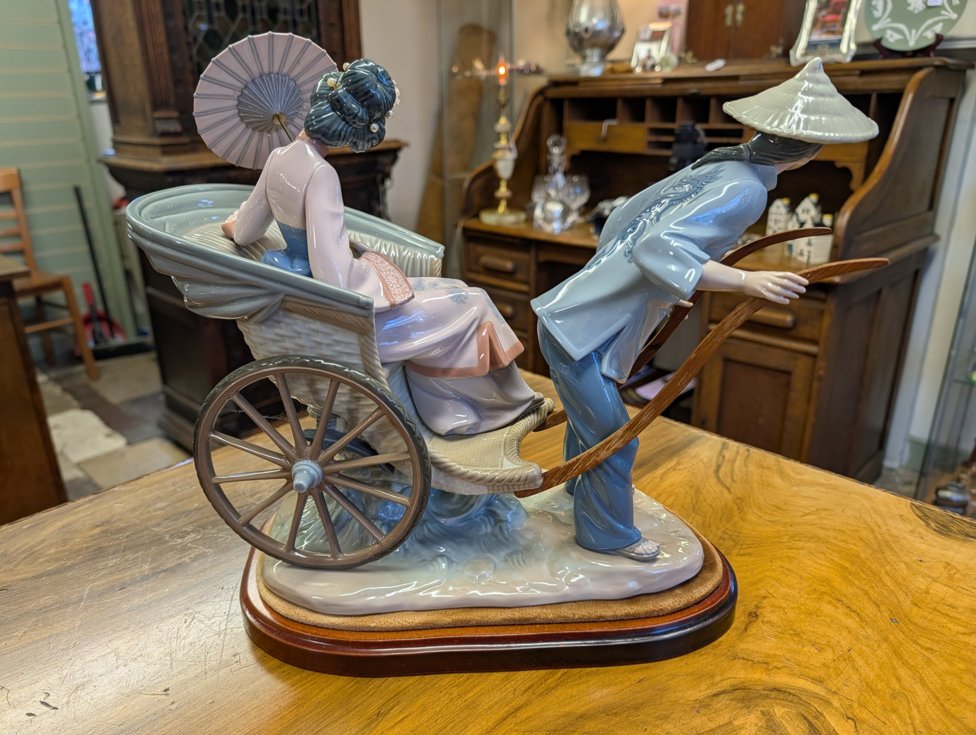Lladro fine porcelain sculpture "A Rickshaw Ride" dating to between 1978 and 2005 when the item was retired. This was designed by the artist Salvador Debon and had an original selling price of around $2200. The item is in excellent condition, (please study the photos) and has only one blemish which is a slight hairline crack in the ladies hand holding the parasol. The sculpture comes with the original wooden base, and is ready to display. There are no other areas of damage or repair other than the hairline to the hand which is invisible unless being looked for.