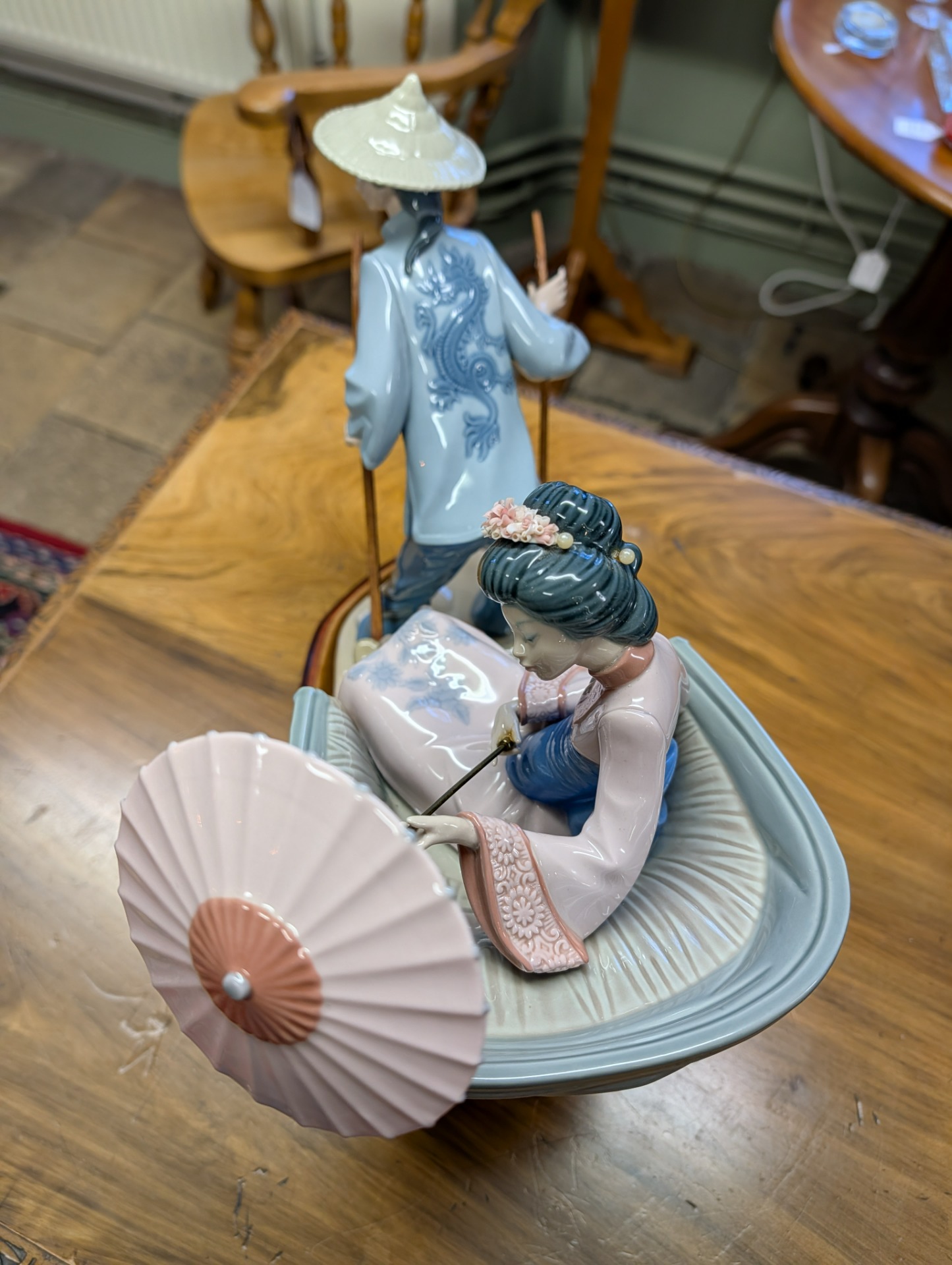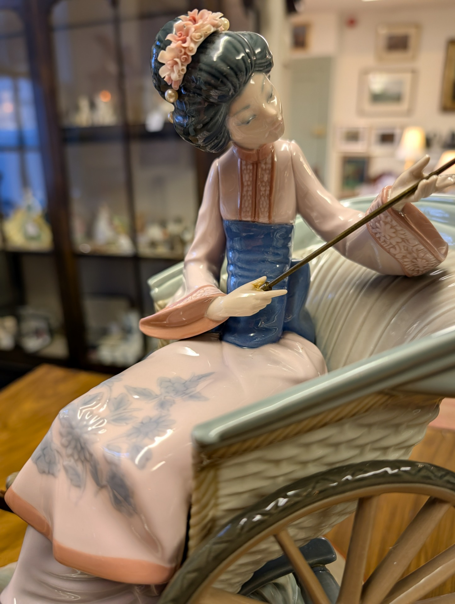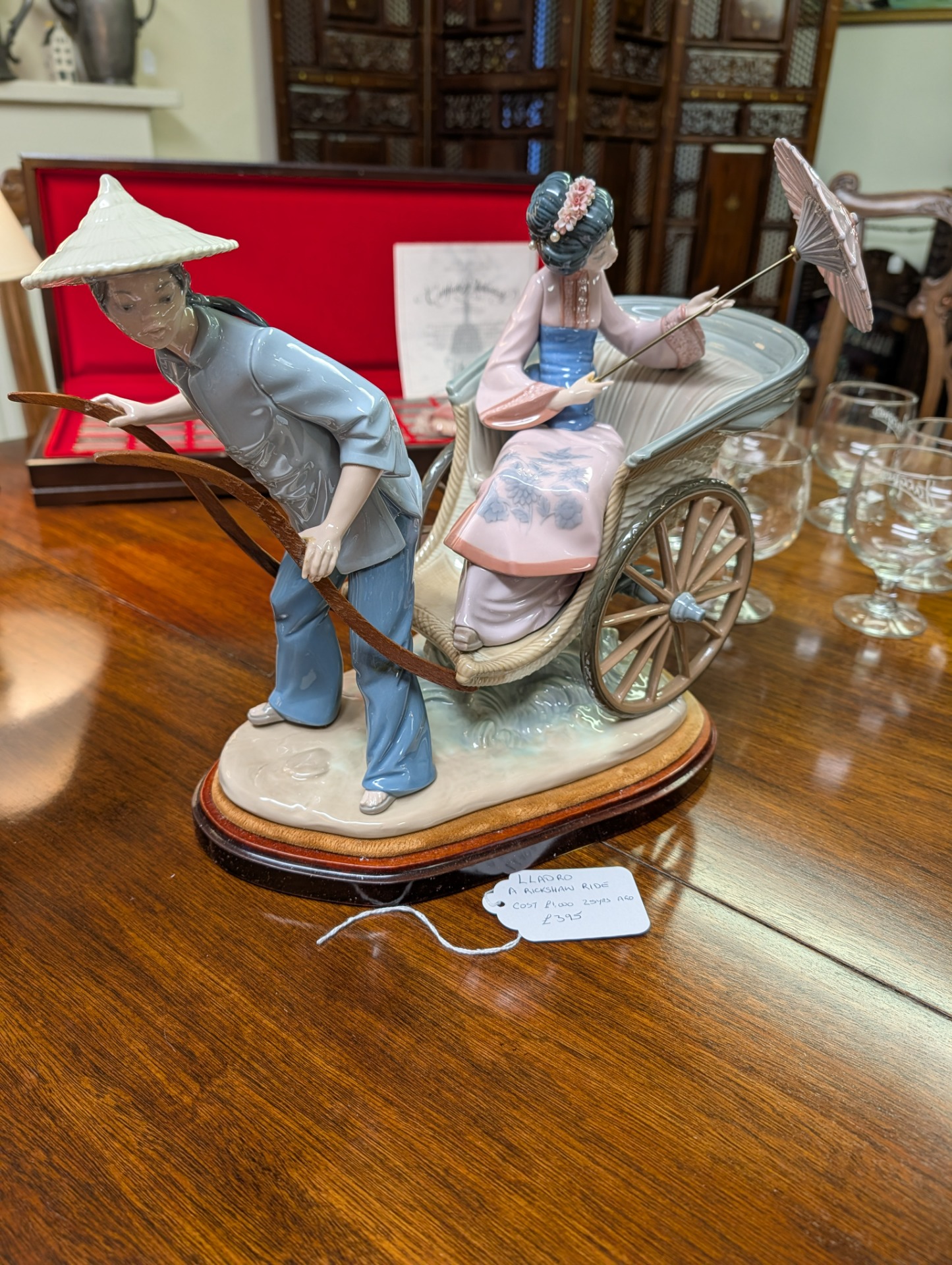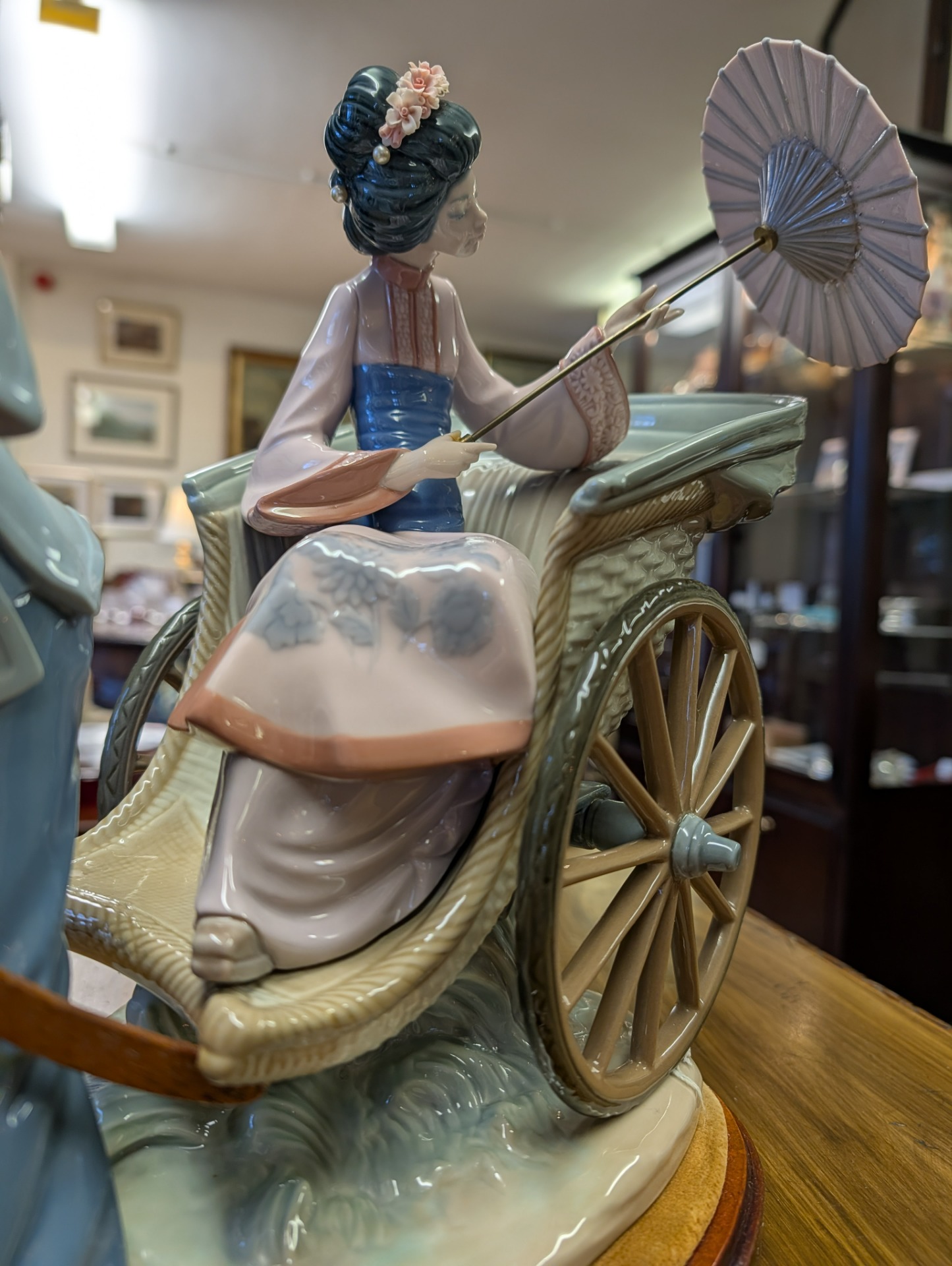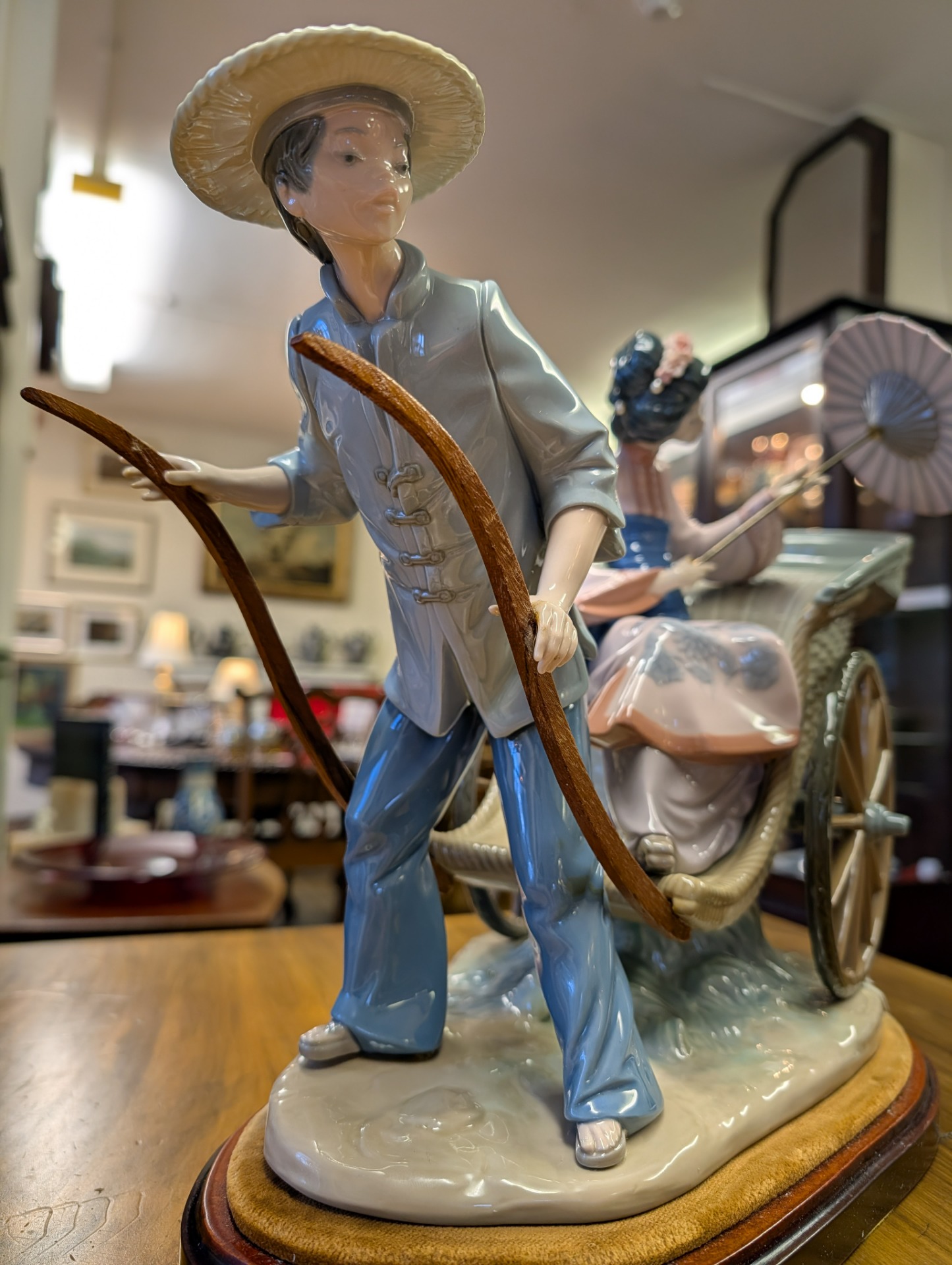 Lladro fine porcelain sculpture "A Rickshaw Ride" dating to between 1978 and 2005 when the item was retired. This was designed by the artist Salvador Debon and had an original selling price of around $2200. The item is in excellent condition, (please study the photos) and has only one blemish which is a slight hairline crack in the ladies hand holding the parasol. The sculpture comes with the original wooden base, and is ready to display. There are no other areas of damage or repair other than the hairline to the hand which is invisible unless being looked for.