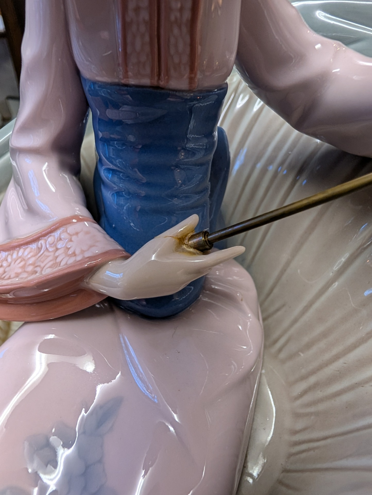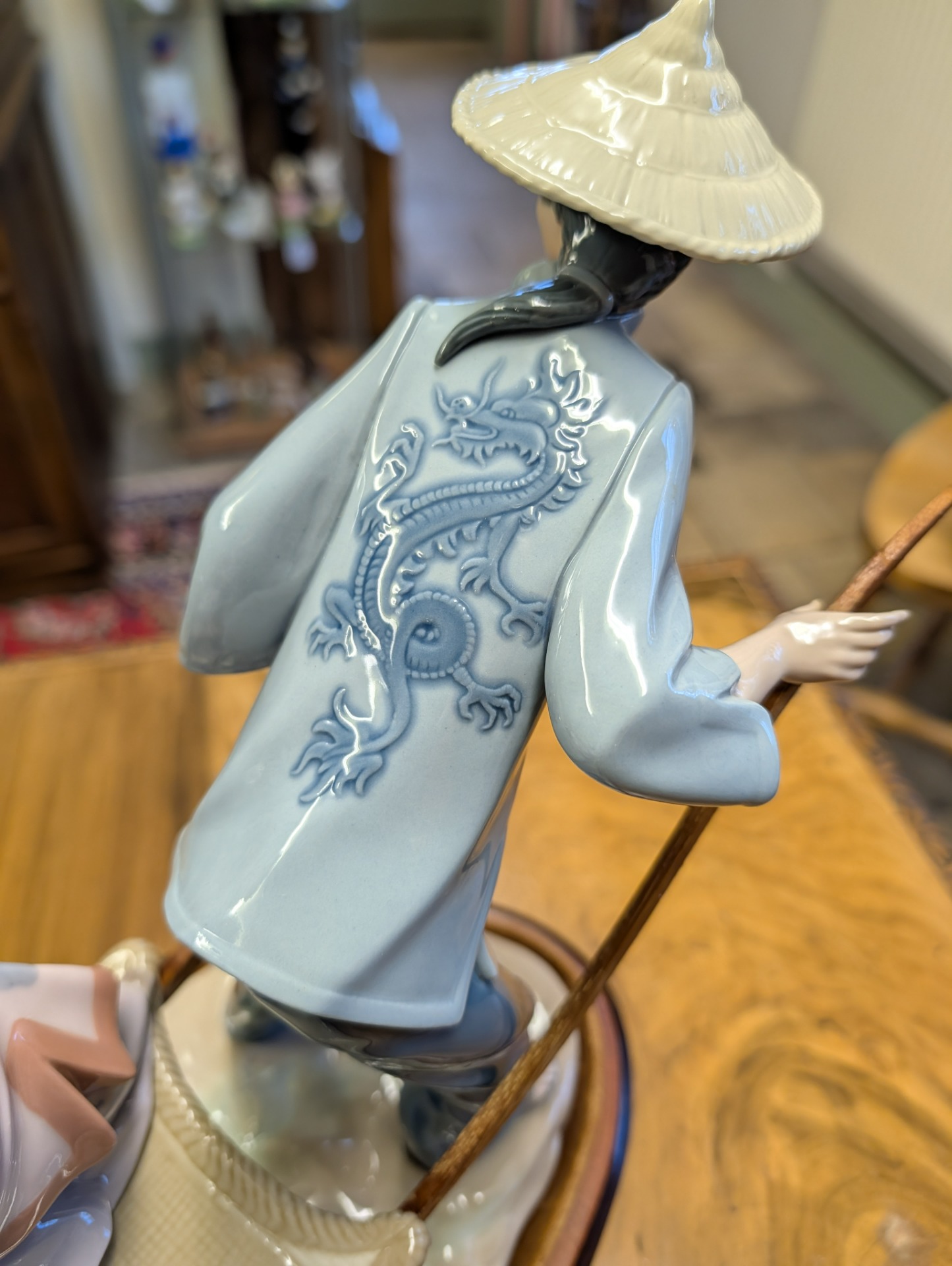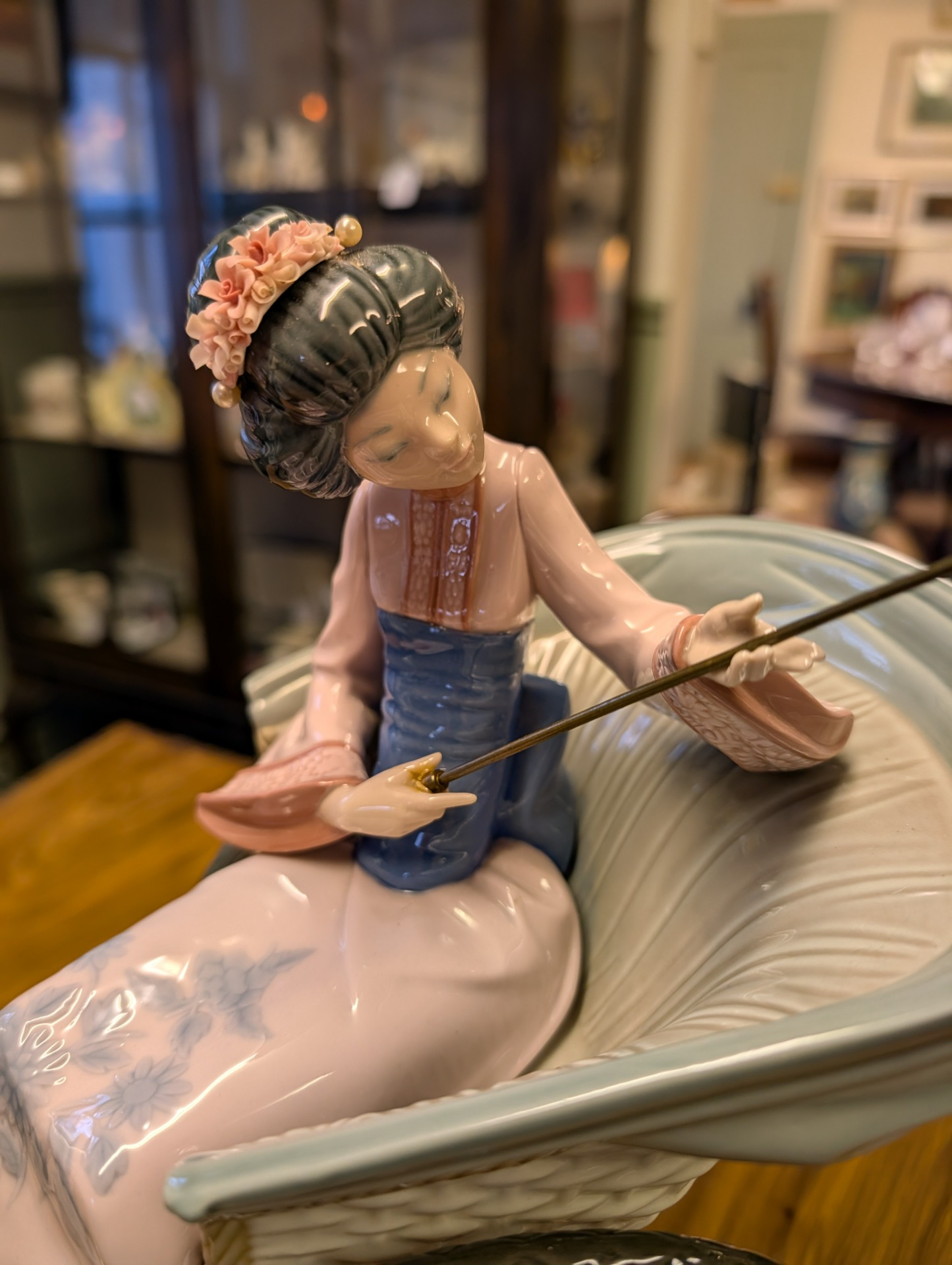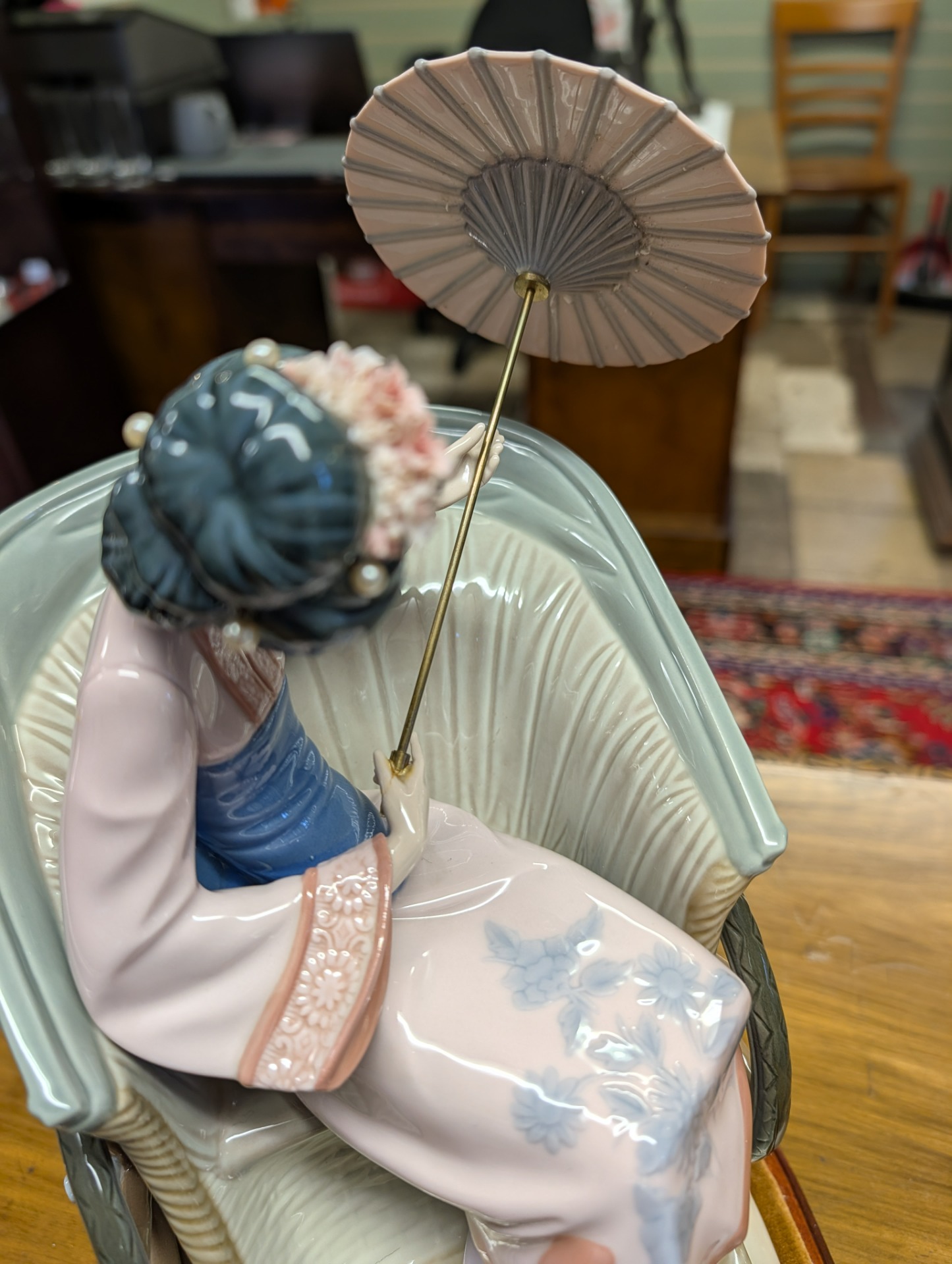 Lladro fine porcelain sculpture "A Rickshaw Ride" dating to between 1978 and 2005 when the item was retired. This was designed by the artist Salvador Debon and had an original selling price of around $2200. The item is in excellent condition, (please study the photos) and has only one blemish which is a slight hairline crack in the ladies hand holding the parasol. The sculpture comes with the original wooden base, and is ready to display. There are no other areas of damage or repair other than the hairline to the hand which is invisible unless being looked for.