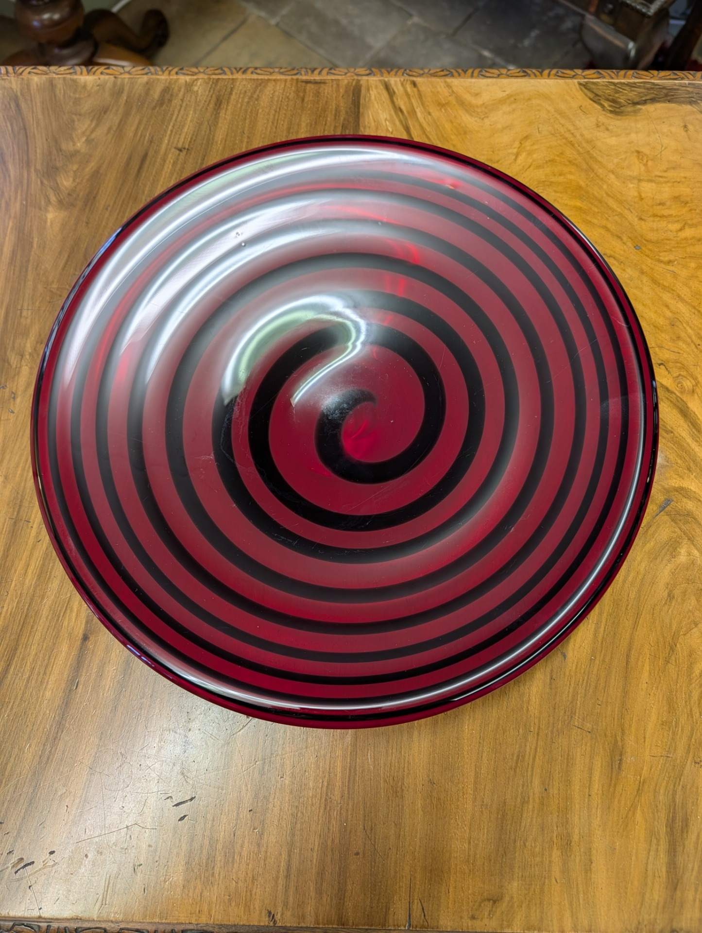 A large shallow Murano Glass dish with a Black on red swirl design.