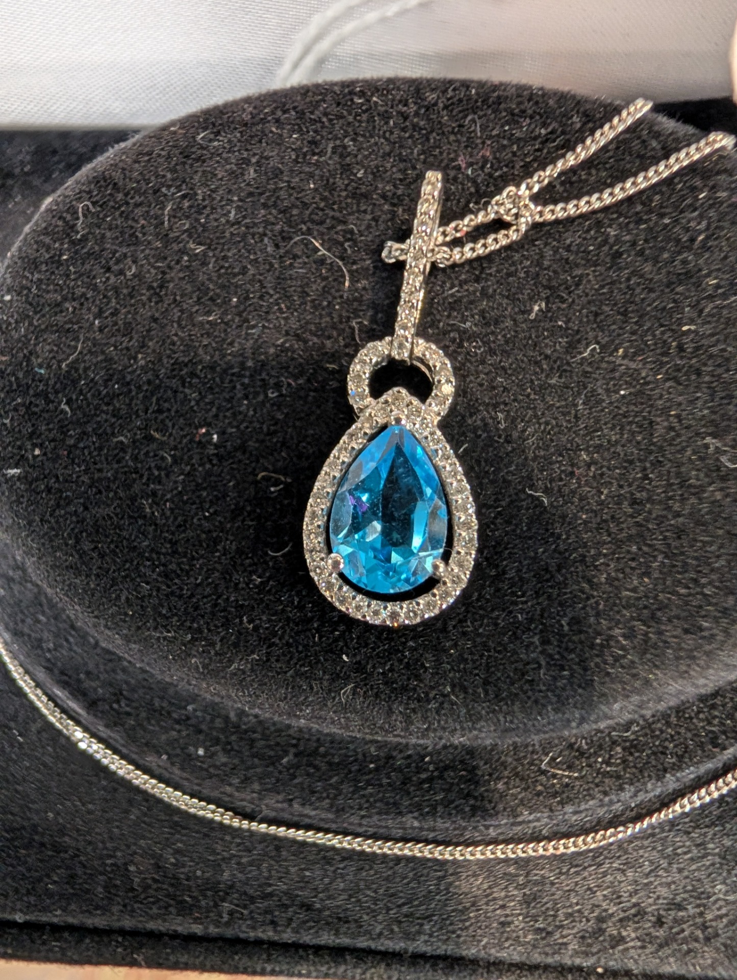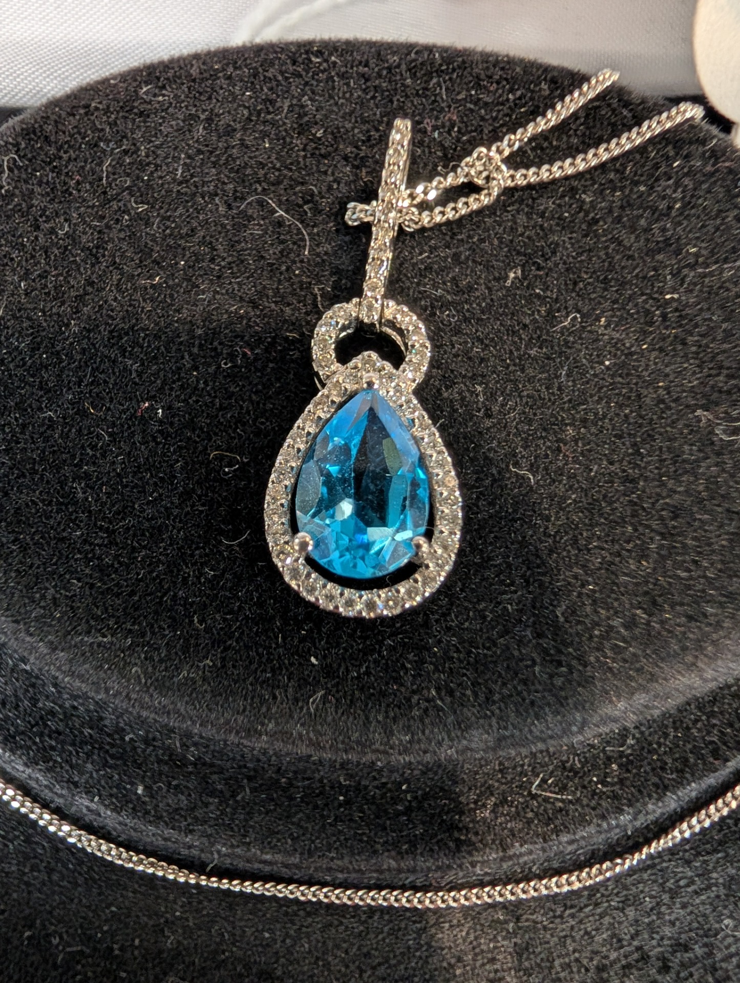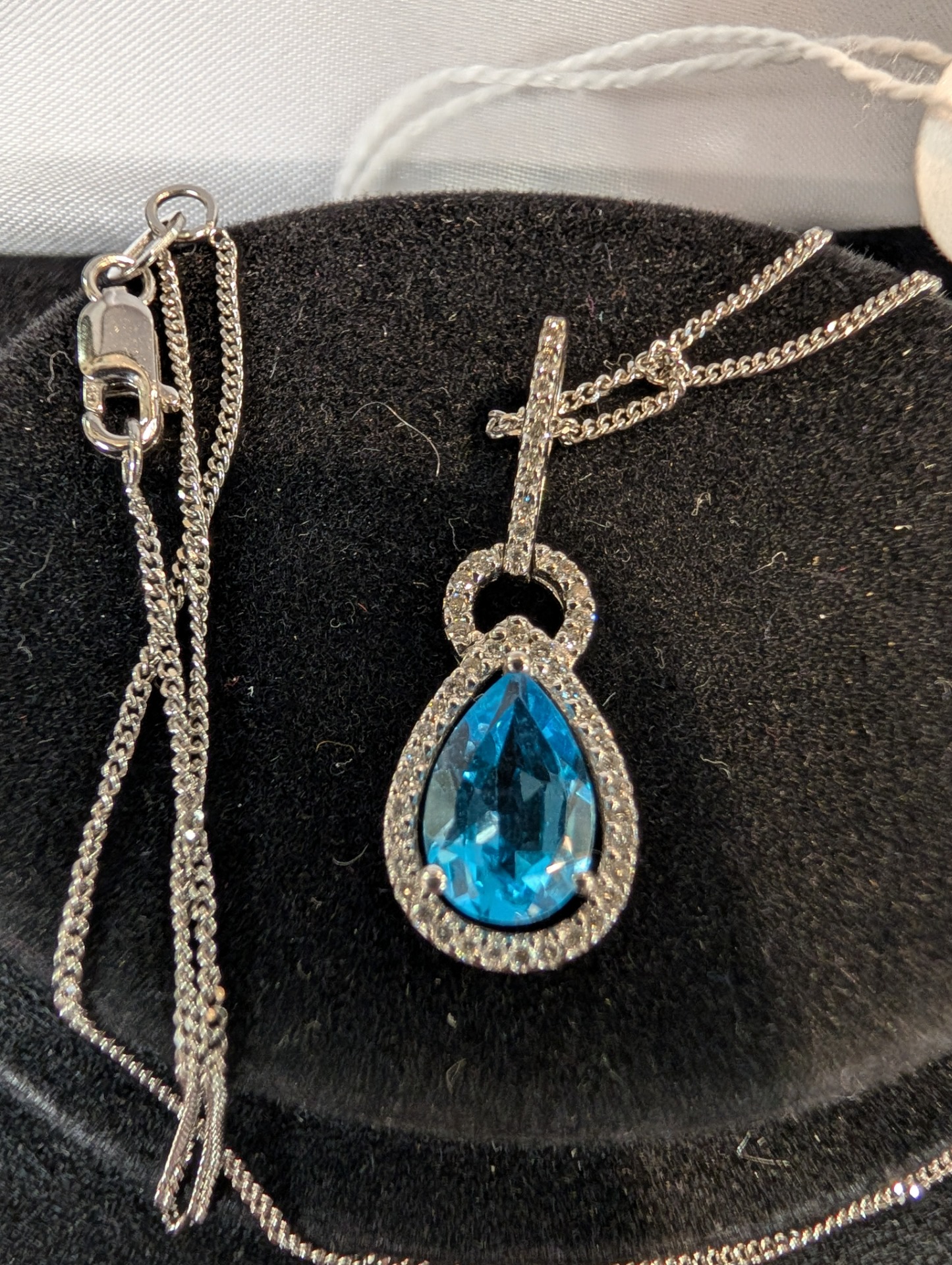 A truly stunning Topaz and Diamond pendant set in 18kt white gold on an 18kt white gold chain, it has to be seen to be truly appreciated!