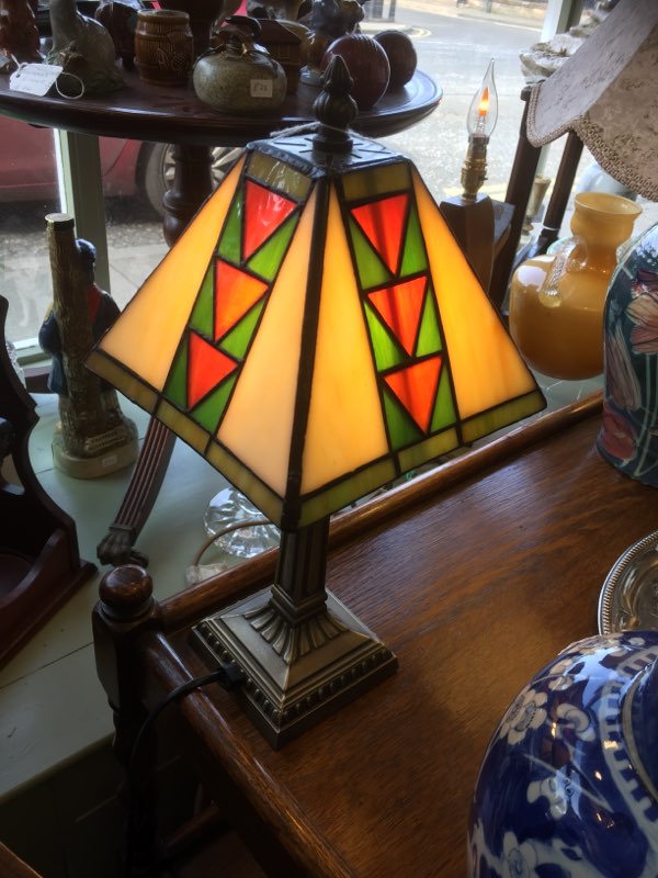 A Vintage Tiffany style heavy base coloured glass lamp with red, green and ivory colours.