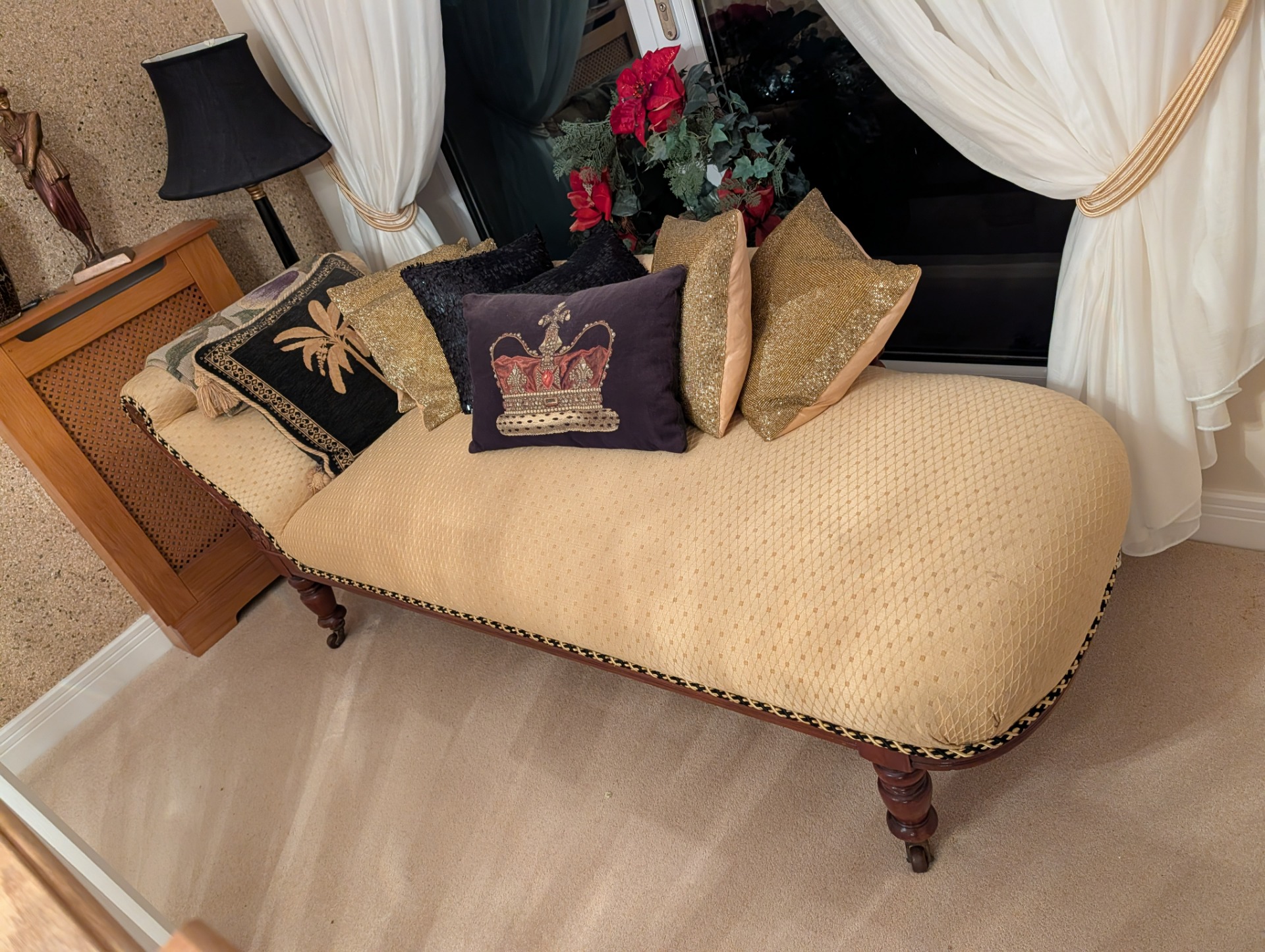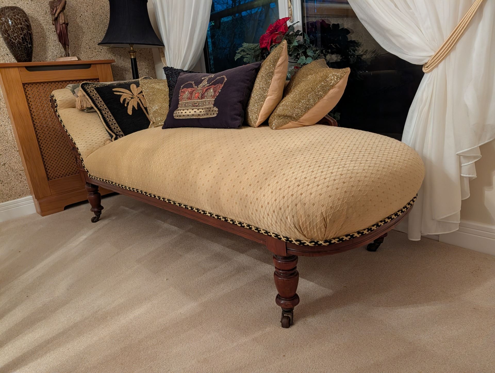Beautifully presented Victorian Chaise Lounge, deeply padded upholstery and a solid oak frame.