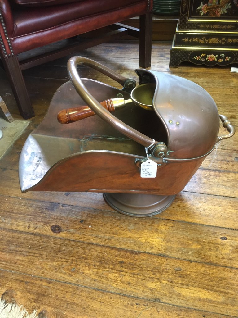 A Victorian Copper coal scuttle with wooden handled shovel.